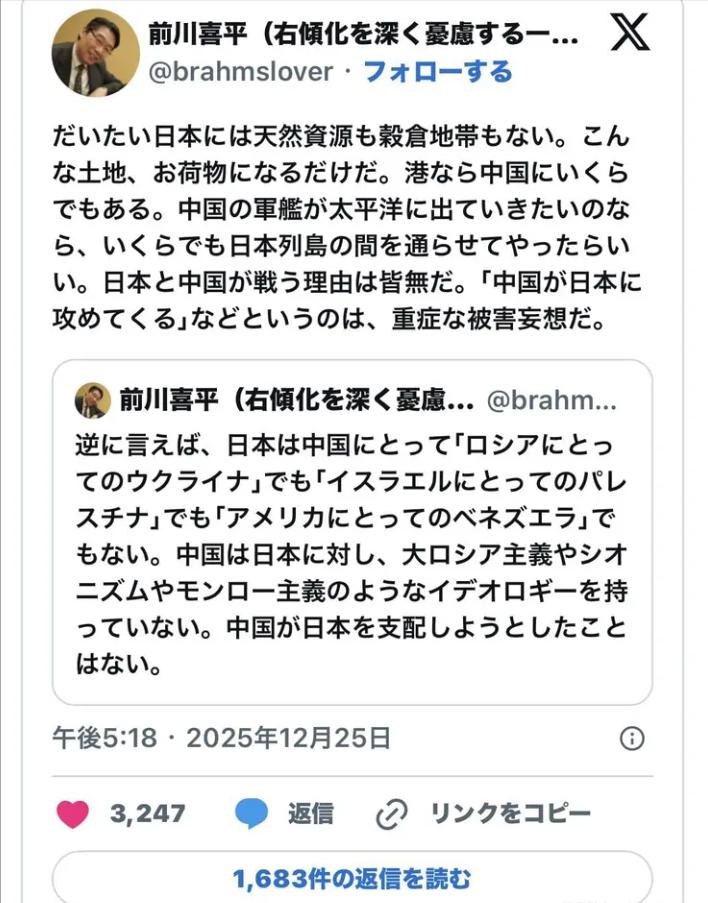 日本前高官前川喜平说过,日本没有充足的矿产,也没有广阔的农耕平原,光靠自给根本养不活这一亿多人口。如果中国真的攻下日本,那还得替日本人想办法吃饱穿暖,这样的负担,谁愿意背?所以他直言,那种宣称中国要进攻日本的说法,完全是一种被害妄想。 这话戳痛了不少日本人的神经,但从现实角度看,确实一针见血,日本的土地狭小,资源紧缺,粮食和能源大部分靠进口。一旦“被占领”,新的统治者不仅要维持社会运行,还要承担高昂的供给成本。 就说日本的矿产现状,这是支撑前川喜平观点的第一个关键依据。很多人可能不知道,日本虽然在工业制造领域实力雄厚,但本土矿产资源极度匮乏,堪称“坐在资源空地上的工业大国”。 根据美国地质调查局2024年发布的2020-2021年日本矿产年鉴显示,日本有储量的矿种仅十余种,且多数不具备经济开采价值,目前国内开采的矿山极少,大部分仅作为战略储备。 哪怕是在硒、钛海绵等少数精炼矿产产量上位居世界前列,但其生产所需的锑、铜、铁、铅等核心金属矿石和精矿,几乎全部依赖进口。 2020年,日本是全球第二大矿产品进口国,占全球矿产品贸易额的8%,同时还是第三大矿物燃料进口国,占全球贸易额的7%,这些数据足以说明,日本的工业运转和国民生活,根本离不开国际资源供应链的支撑。 还有农业领域,前川喜平说“没有广阔的农耕平原,光靠自给养不活一亿多人口”,这更是被数据反复验证的事实。日本农林水产省2020年公布的数据显示,日本现有耕地面积仅437.2万公顷,且还在因弃耕、转为宅基地等原因持续减少。 而且日本的农地极度分散零碎,平均耕地面积在2公顷以下的农户占总数的80%,远超葡萄牙、意大利等同类国家。这种小规模经营模式,再加上农业人口的严重老龄化——65岁以上从业者占比高达45.2%,导致日本农地弃耕问题突出,1980到2010年的弃耕面积就达到40万公顷,相当于一个滋贺县的面积。 耕地不足、劳动力匮乏,直接导致日本粮食自给率长期偏低,根本无法支撑一亿多人口的粮食需求,日常所需的大量农产品都需要从海外进口。 从国家战略角度来说,任何一个国家的对外行动,都必然考虑成本与收益。正如前川喜平所言,打下日本不仅没有任何经济收益,反而要背上养活一亿多人的沉重包袱。 且不说中国一贯坚持和平发展道路,始终奉行防御性国防政策,单从现实利益考量,也绝不会做出这种得不偿失的选择。 要知道当前中日之间存在紧密的经济互补关系,中国是日本重要的贸易伙伴,双方的经济合作能带来实实在在的利益,这种互利共赢的关系,远比所谓的“军事对抗”更符合两国的根本利益。 既然逻辑上站不住脚,为什么“中国进攻日本”这种说法还能在日本流传?这背后其实是部分势力的刻意炒作和焦虑宣泄。 近年来,日本部分媒体和政客把“中国话题”当成了“流量密码”,不断编造虚假信息煽动对立。比如日本网络电视ABEMA曾播出节目,造谣“和歌山县7个水源被中国人或中国资本购买”,但经《读卖新闻》调查,所谓的消息源根本不存在,供水部门也明确驳斥“河流无法被购买,供水设施也无被收购情况”。 还有日本经济安保大臣曾在国会上,把“中国人购买山口县土地”的传言当作事实背书,最终因无任何核实依据被迫道歉。这些案例都说明,不少“中国威胁论”的论调,本质上是部分势力为了转移国内矛盾、博取关注而制造的谎言。 但值得警惕的是,这种虚假炒作已经形成了产业化链条,有公司甚至专门招募人员制作“中国批判系”视频,批量生产虚构情节煽动对立。 但谎言终究无法掩盖真相,日本经团联的调查显示,78%的会员企业认为“过度反华报道”导致中日合作谈判周期平均拉长1.8倍,正常的商业交流因无端猜忌而受阻。对普通民众而言,持续被虚假信息误导,只会助长排外情绪,破坏社会的多元包容氛围。 前川喜平的言论,其实是戳破了“中国威胁论”的窗户纸。在全球化时代,国与国之间的互信建立在事实基础之上,中日两国一衣带水,经济互补、文化相通,合作共赢才是唯一正确的选择。 那些刻意渲染“中国进攻日本”的势力,不仅无视客观事实,更损害了两国人民的根本利益。与其沉溺于毫无根据的被害妄想,不如正视现实,推动中日关系回归健康发展的正轨。毕竟,和平发展才是时代主流,任何违背历史潮流的谎言,最终都会被现实所揭穿。 MCN双量进阶计划