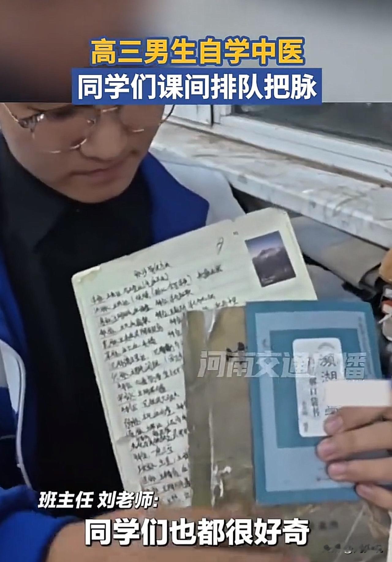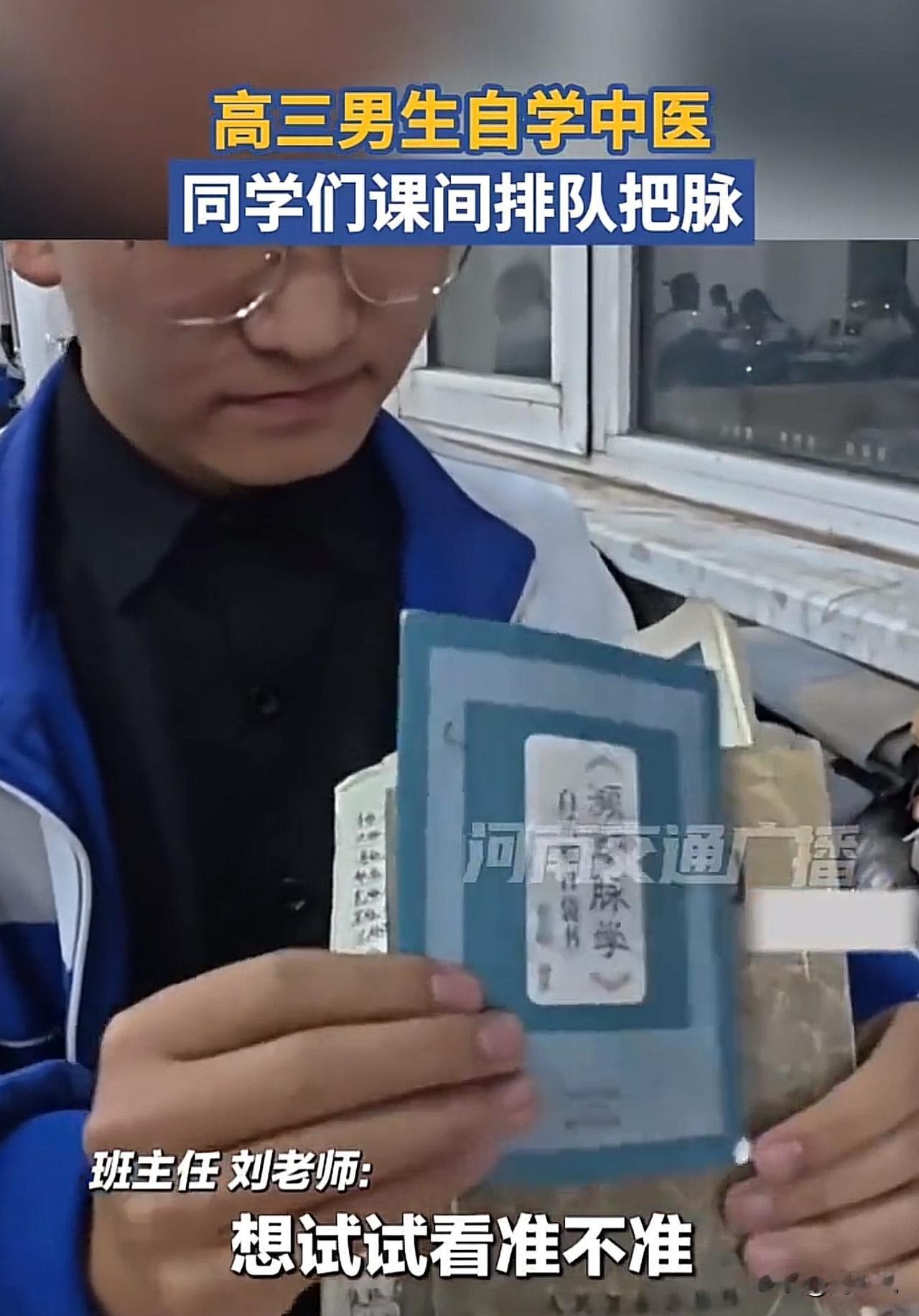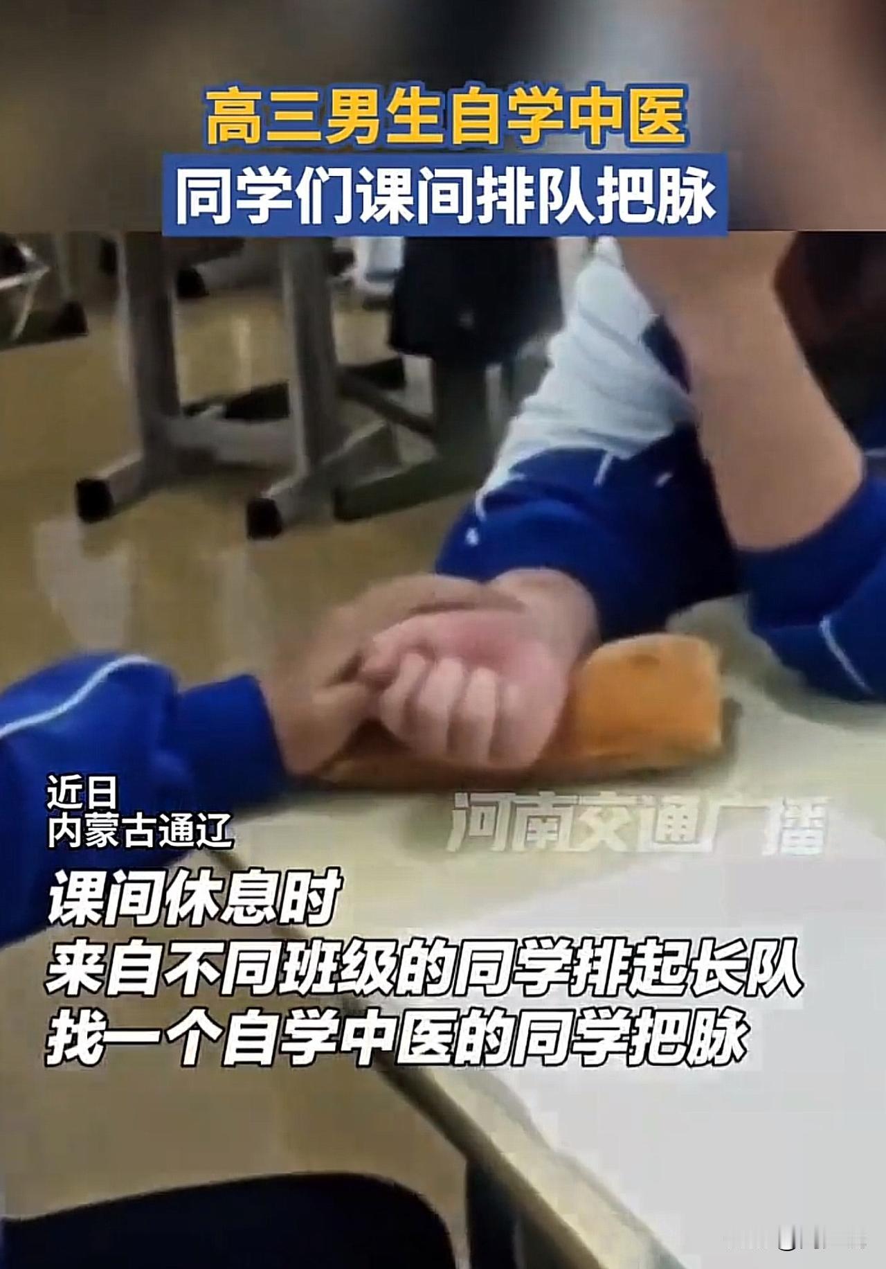 #高三男生自学中医 同学们排队把脉#“真是年少有为!”河南,一名高三男生竟然课间时间给同学把脉,而且排了很长的队,挨个把脉问诊,这一幕暖心又惊艳的画面,引得无数人点赞。 据悉,这名男生没有专业师承,全靠自己课余时间自学中医,慢慢摸索钻研脉诊、中医知识。同学们出于好奇找他把脉,没想到他把得又准又细致,和医院大夫的判断相差无几,慢慢的,找他把脉的同学越来越多,课间排队成了班级常态。 此事曝光后,不少网友纷纷称赞:“这才是少年该有的模样,不沉迷游戏不荒废光阴,把课余时间用在正途上,太可贵!” 也有人说:“中医传承就需要这样的年轻力量,少年有志,未来可期!” 周少想说在学业压力满满的高三,这名男生能沉下心深耕中医,这份热爱与坚持,远比分数更珍贵。他不仅守住了对传统文化的敬畏与热爱,更用行动诠释了何为真正的少年志气。 当下的教育,拼的从不是死读书的能力,而是这份能沉下心深耕热爱、主动探索求知的本心。 这份对传统文化的传承之心,这份专注与执着,终将成为他人生里最珍贵的底气,这样的少年,自带光芒,也让我们看到了传统文化代代相传的希望!#长沙新朋友# #寻美三湘#