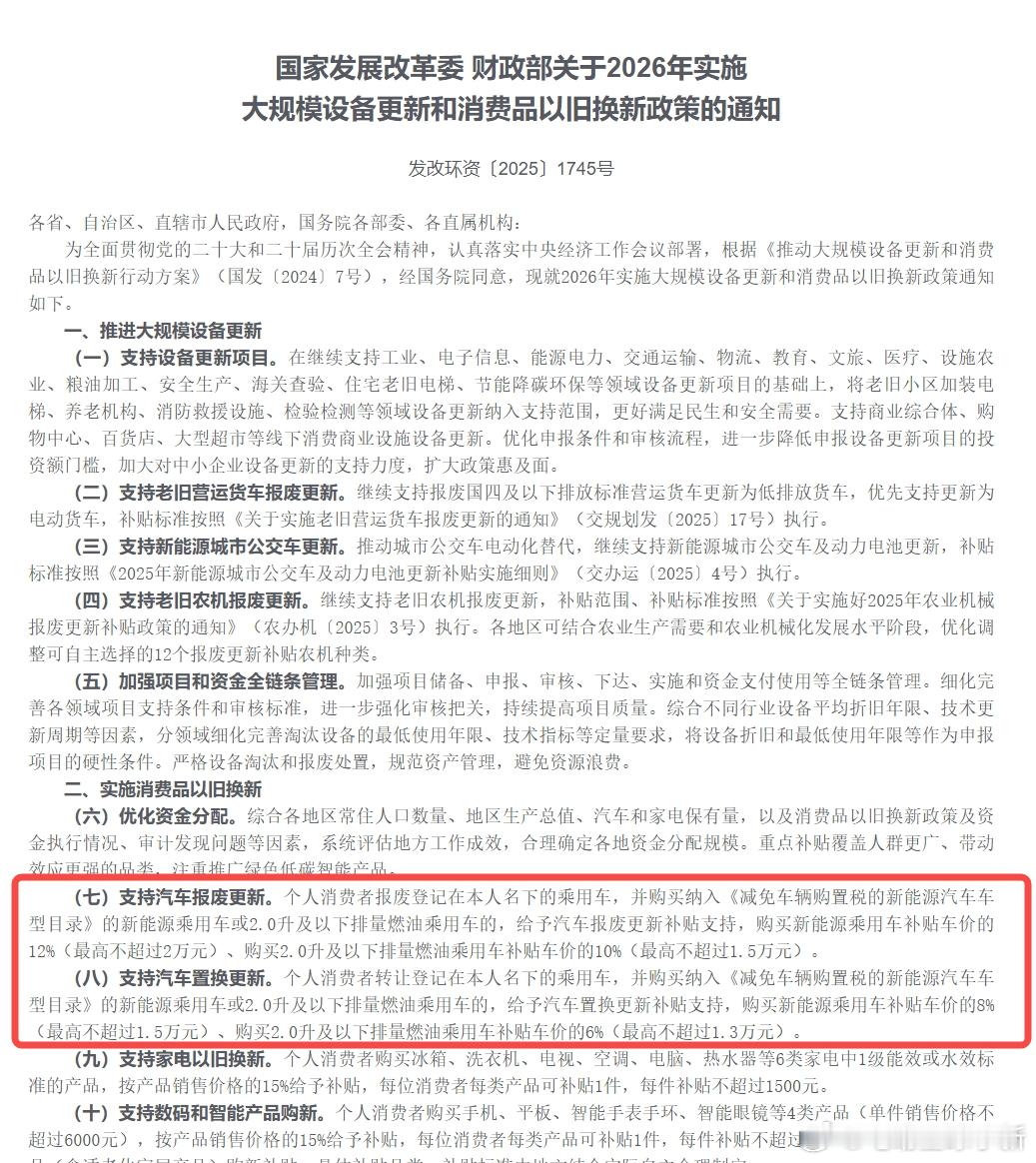 2026 年汽车以旧换新补贴政策来了!⭐报废更新(报废自己名下乘用车)- 买新能源车(进减免购置税目录)→ 补贴车价 12%(最高 2 万)- 购买 2.0 升及以下排量燃油乘用车→ 补贴车价 10%(最高 1.5 万)⭐置换更新(转让自己名下乘用车)- 买新能源车(进减免购置税目录)→ 补贴车价 8%(最高 1.5 万)- 购买 2.0 升及以下排量燃油乘用车→ 补贴车价 6%(最高 1.3 万)2026年国补政策来了