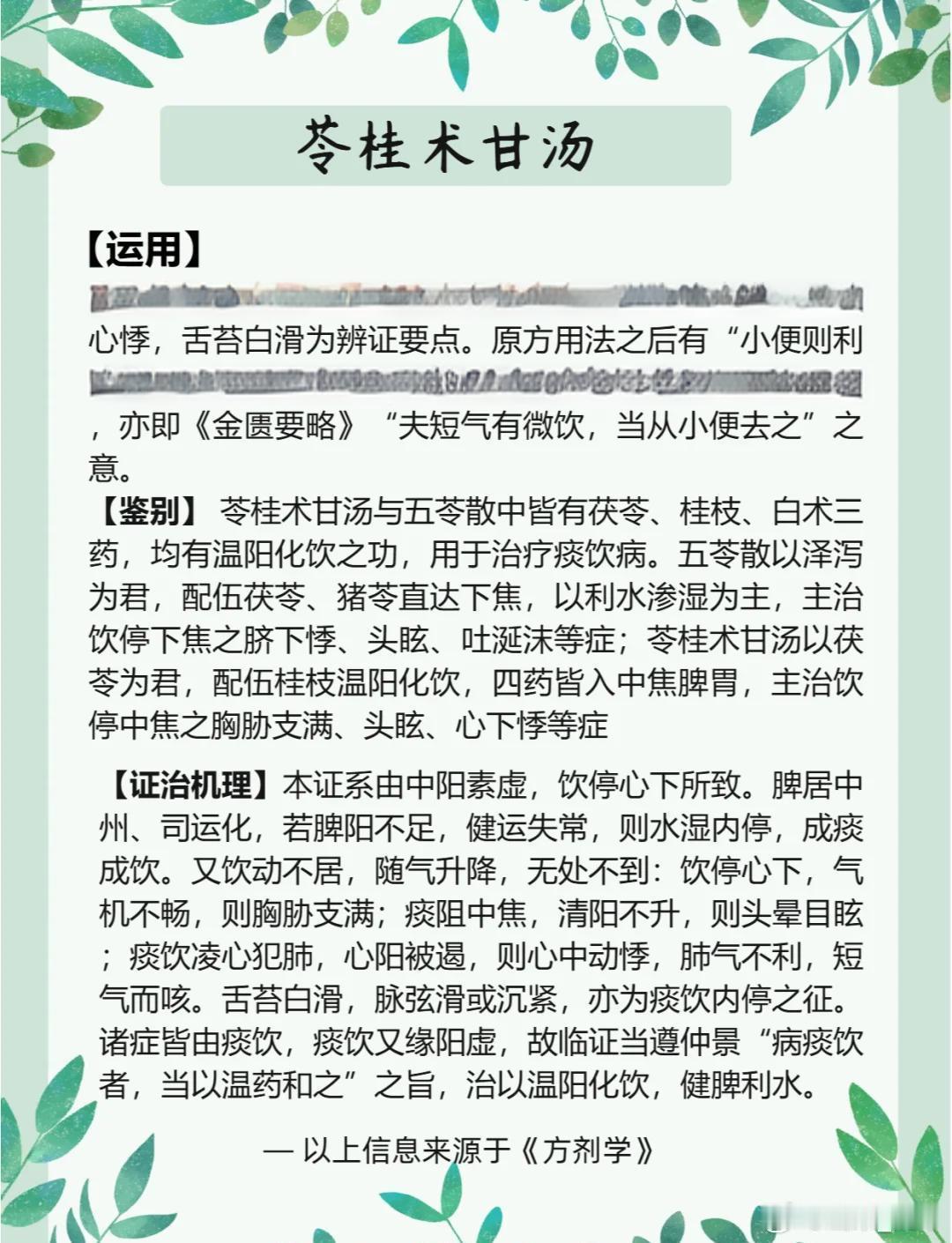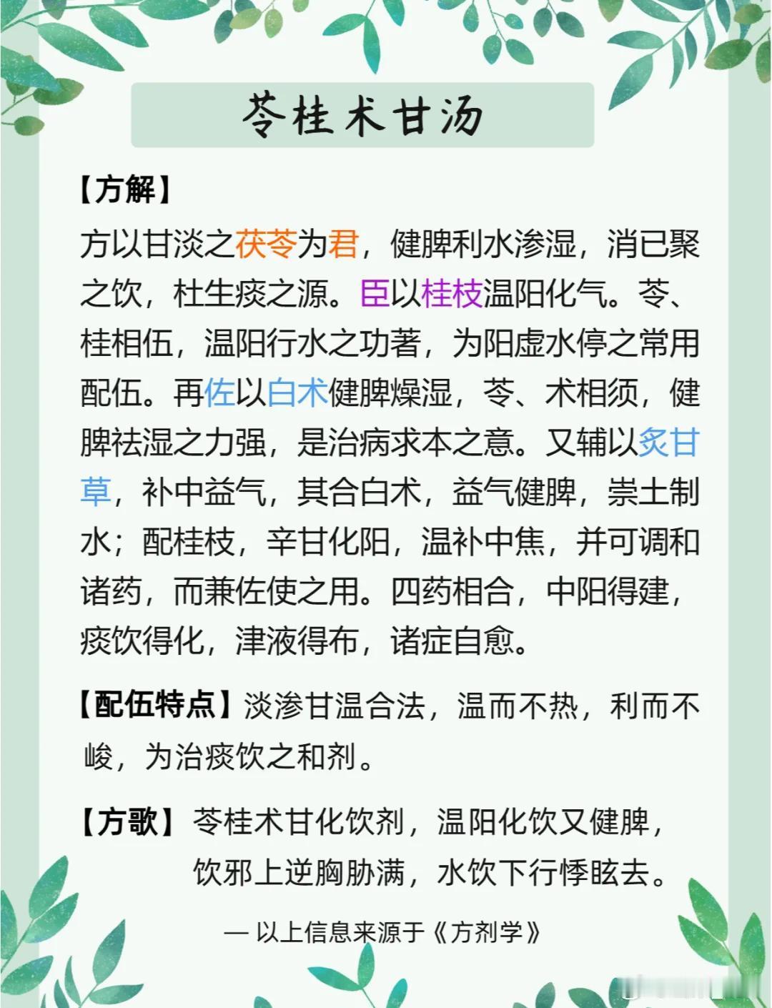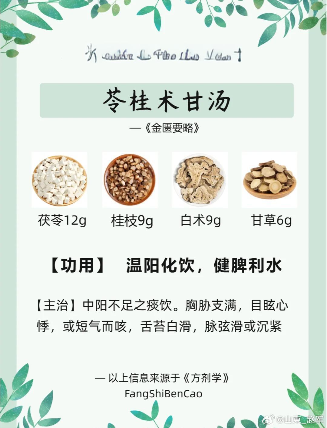 中老年人“心肺保护神”:苓桂术甘汤、苓桂枣甘汤、苓桂姜甘汤苓桂术甘汤、苓桂枣甘汤、苓桂姜甘汤,三个方剂都出自中医名著《伤寒论》,都是治水气病的重剂良方,都是中医闻名的“苓桂剂”,在现代中医临床,这三个方剂还有一个名称,叫中老年人“心肺保护神”。每年十二月底、次年一月初,气候寒冷,寒潮来袭,很多中老年人出现气短、气逆、胸闷、咳嗽、心悸、痰多等症状,感觉哪儿都不舒服,这是身体“阳消阴长”的调整阶段。冬季主气是寒,阴冷肃杀是底色,中老年人身体机能走下坡路,素体阳虚,中阳不足,运化升清功能下降,水湿渐生,而且容易被冬季之阴寒引动,凝结为痰饮,上犯心肺。当中老年人群体的心肺功能减弱,或有心肺隐疾旧病,无法克制阴寒之气上犯,那么相关的呼吸道疾病、心脏问题就多发易见了,越是气候深寒阴冷,症状表现越明显,越严重,解决办法就是“温阳化饮”,《伤寒论》的苓桂剂可担当大任。苓桂剂三方之中,以苓桂术甘汤最为有名,也是当之无愧的“老大”。该方条文见于《伤寒论》第67条“伤寒,若吐…茯苓桂枝白术甘草汤主之”,还见于《金匮要略》第16条、第17条,总的用途是“温阳化饮、健脾利水”,其中茯苓、桂枝温阳化气、利水平冲,茯苓、白术健脾益气、利水渗湿,桂枝、甘草加强通阳,甘草、白术健脾和降逆。苓桂术甘汤通过4味药的温、化、利、降,把生痰的隐患破除,让身体“破阴通利,拨云见日”,所以该方又被称为“利水降冲除湿第一方”。以苓桂术甘汤为基础,衍生出大量方剂,如苓桂味甘汤、苓桂芥甘汤、苓桂参附汤、五苓散等,但从“保护心肺”的角度看,以苓桂枣甘汤、苓桂姜甘汤(即茯苓甘草汤)最为有名,这3个“苓桂剂”,临床该如何选用?1、从方剂组成看苓桂术甘汤以茯苓、桂枝、白术、甘草成方,突出白术的作用,健脾化湿,除中焦之寒饮。苓桂枣甘汤以茯苓、桂枝、白术、大枣成方,用大枣强化脾胃运化,辅以甘草温脾助运,培土制水。苓桂姜甘汤以茯苓、桂枝、白术、生姜成方,用生姜温胃散水,除中焦之水滞。2、从作用部位上看苓桂剂都能治阳虚水停,常见于素体阳虚,或误用寒凉药,误用汗法、下法和吐法伤阳,致使气化不利,水液代谢异常。苓桂术甘汤是在错治或误治,引起脾虚水气上冲时选用,重点在中焦脾胃;苓桂枣甘汤是汗后心阳虚,欲做奔豚时选用,重点在脐下和下焦;苓桂姜甘汤是治疗汗后水停中焦,重点在上焦部位,以心肺为主。3、从功能主治看苓桂术甘汤作为苓桂剂的“代表方”,是治疗痰饮、水湿停聚中焦的理想方剂,其病势会引起心下逆满,吐清水痰涎,水气上蒙清窍则眩晕。苓桂枣甘汤是苓桂术甘汤去白术加大枣,治疗“奔豚”的良方;苓桂姜甘汤用于汗出过多,胃阳被伤,胃腑的腐熟功能受损,水停中焦引起不渴,四肢逆冷,心下悸动。作为现代临床治心肺疾病的方剂,三个“苓桂剂”分别治什么现代临床病症?苓桂术甘汤是脾阳虚弱,痰湿中阻,见于肺心病、风心病、慢性胃炎、心包积液、心力衰竭、冠心病等。苓桂枣甘汤是胃下部疾病更常用,如心悸、痫症、慢性肾炎、下焦有水积聚和水肿等。苓桂姜甘汤是肺胀、心悸、慢性胃炎、突发水肿等问题。同时要注意,因为水邪停滞的病因不同,水邪在身体停蓄部位有异,阳气受遏的程度不同,病变涉及的脏腑不一样,还伴有夹杂兼证的差异,这些都需要通盘考虑,不可一刀切。临床用药需遵医嘱,不可乱用。 淄博·广成中医