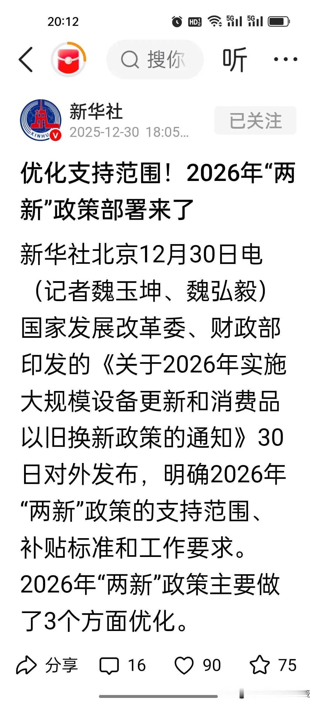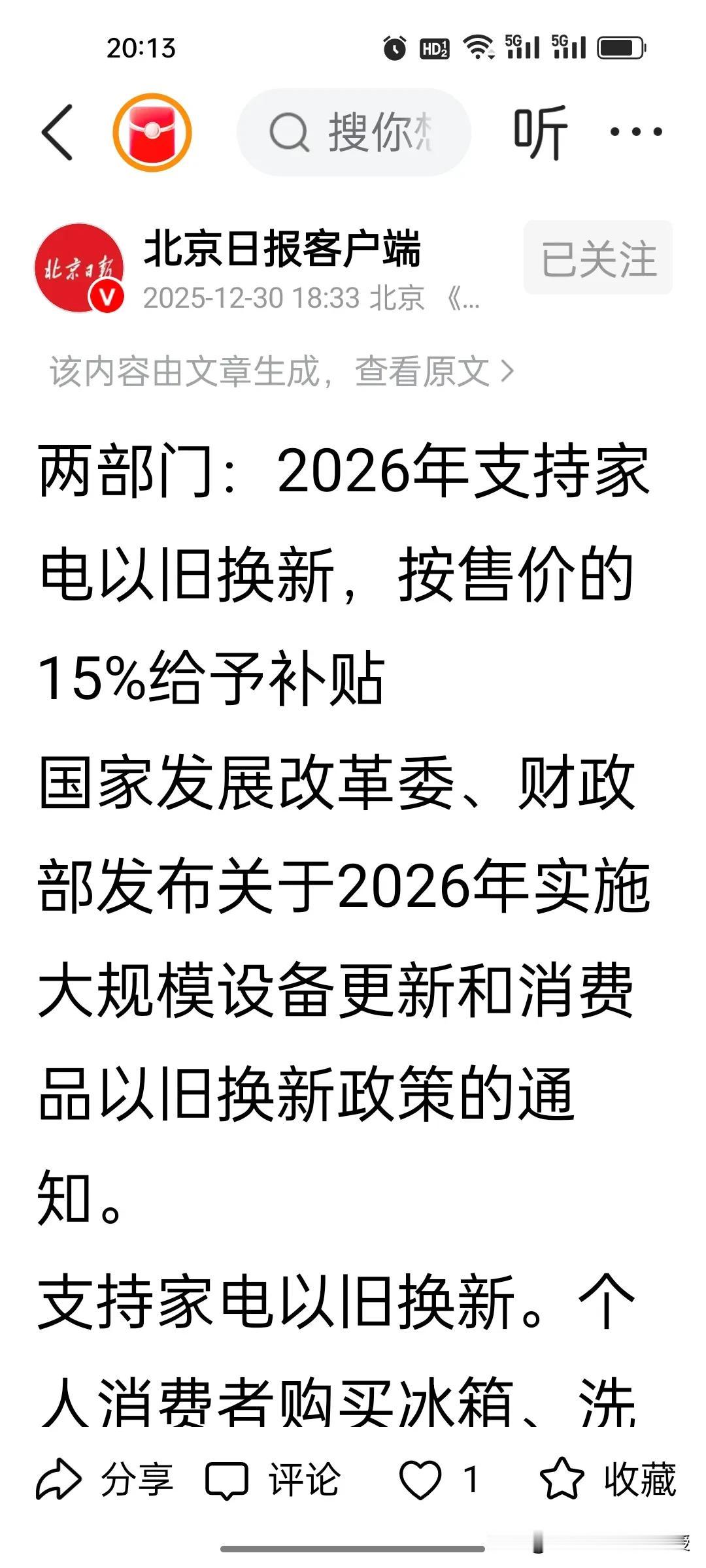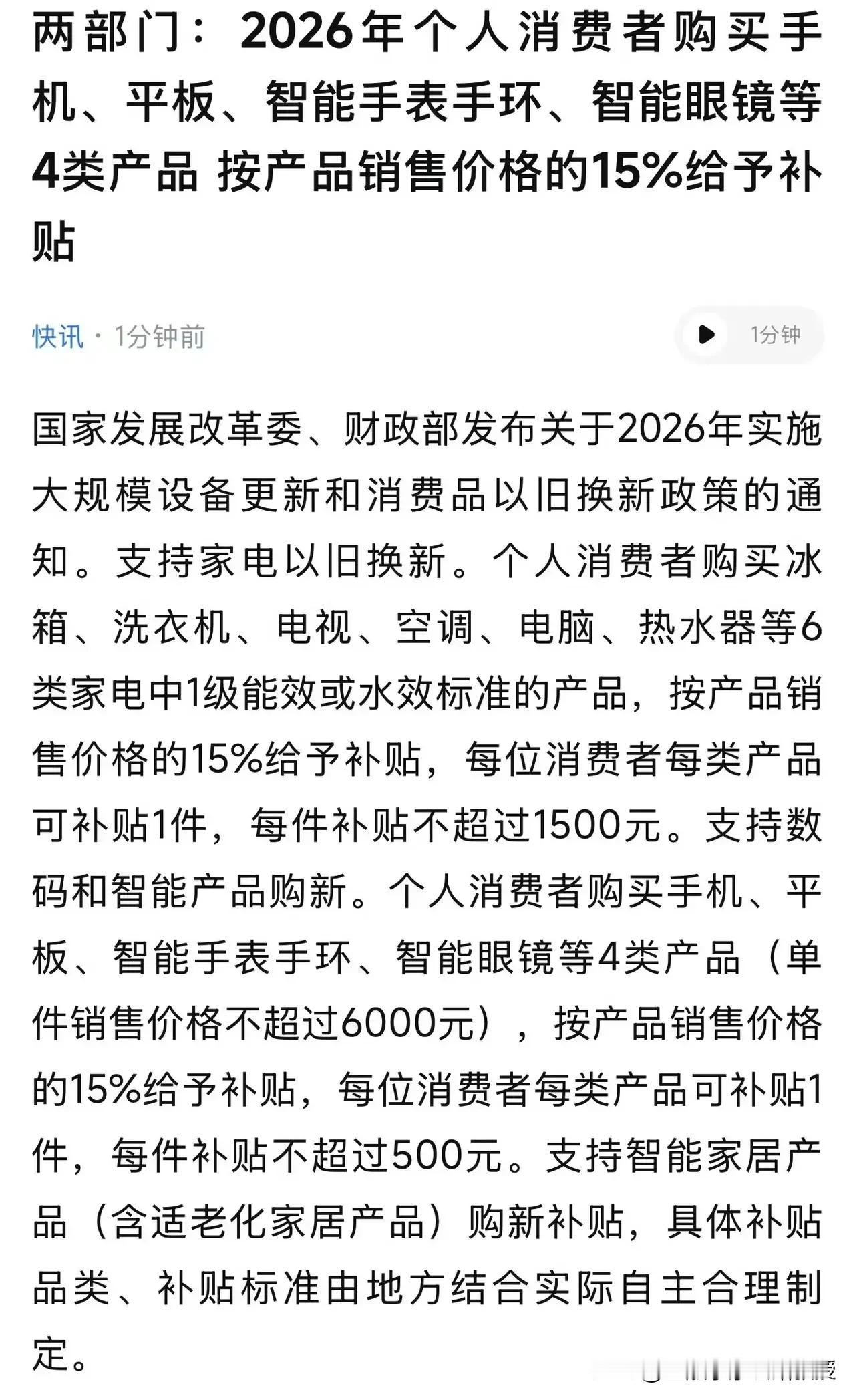 刚发布的2026国补精准发力,三大新意太懂老百姓的需求! 当前首批625亿元超长期特别国债已下达,全年规模预计达5000亿元,较2025年3000亿元大增约67%,补贴范围全面扩大,预计可带动消费超2.5万亿元,直接拉动GDP增长约1个百分点,这真的是真金白银精准滴灌! 三大硬核新意: 1. 智能眼镜首入补贴,数码智能类扩至5类,单件最高补500元; 2. 汽车以旧换新改按车价比例补,新能源最高补2万; 3. 家电只补1级能效/水效,按售价15%补,单件封顶1500元。 很多专家建议国补要扩大范围,这次确实做到了,今年这份国补既有硬核红利的力度,又有精准施策的巧思,既温暖了百姓消费的心,又给了产业升级的信心,为扩大内需,增强消费奠定了坚实的基础,实在是惠民利企的好政策!