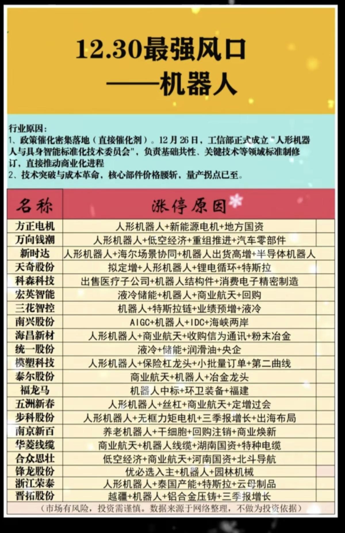 12.30周二 最强风口:机器人! 有望成为市场下一个爆发点! 1.政策催化,机器人相关标准修订 2.技术突破和成本革命 3.特斯拉机器人即将外包量产