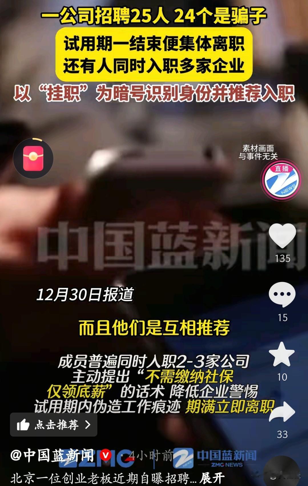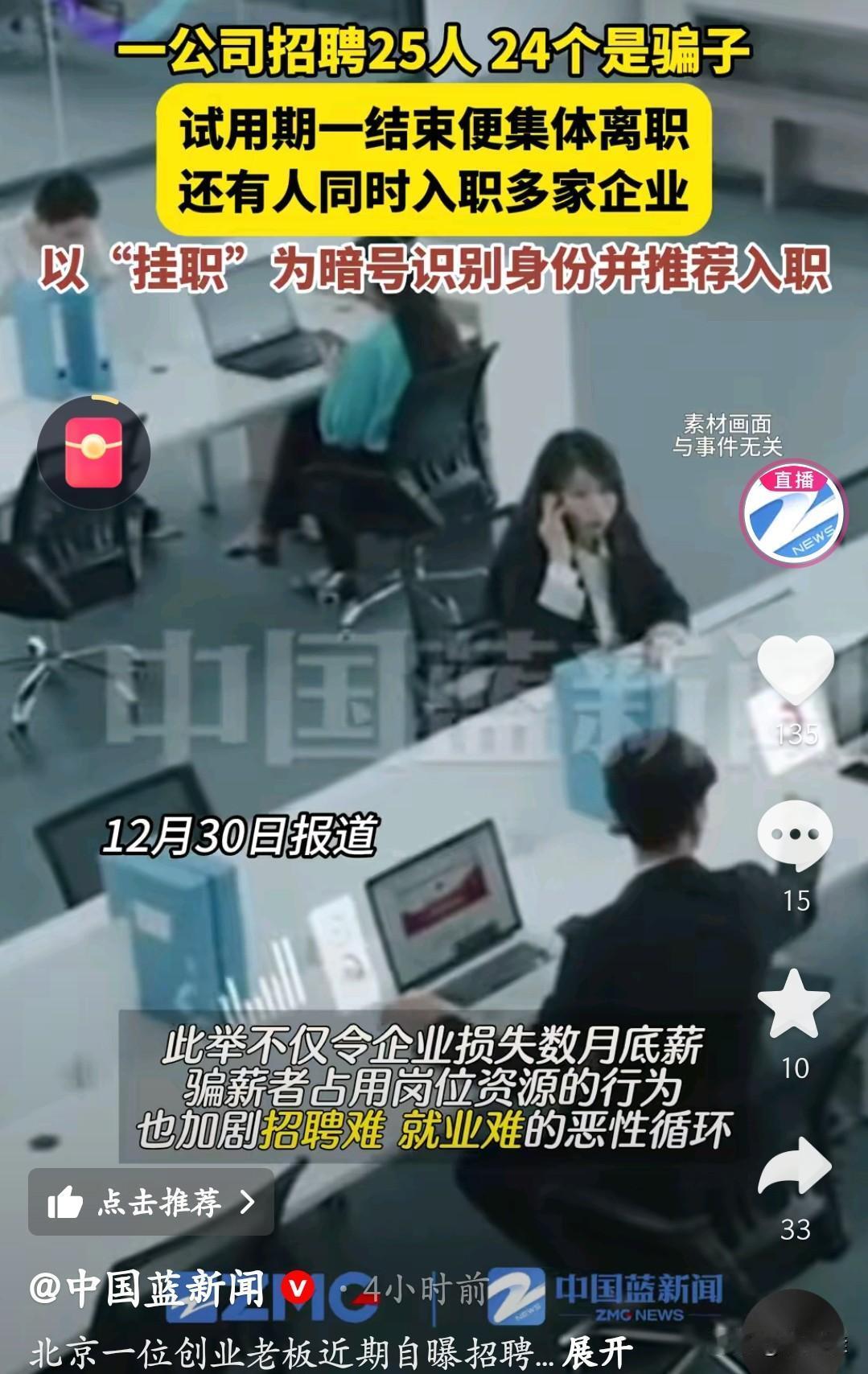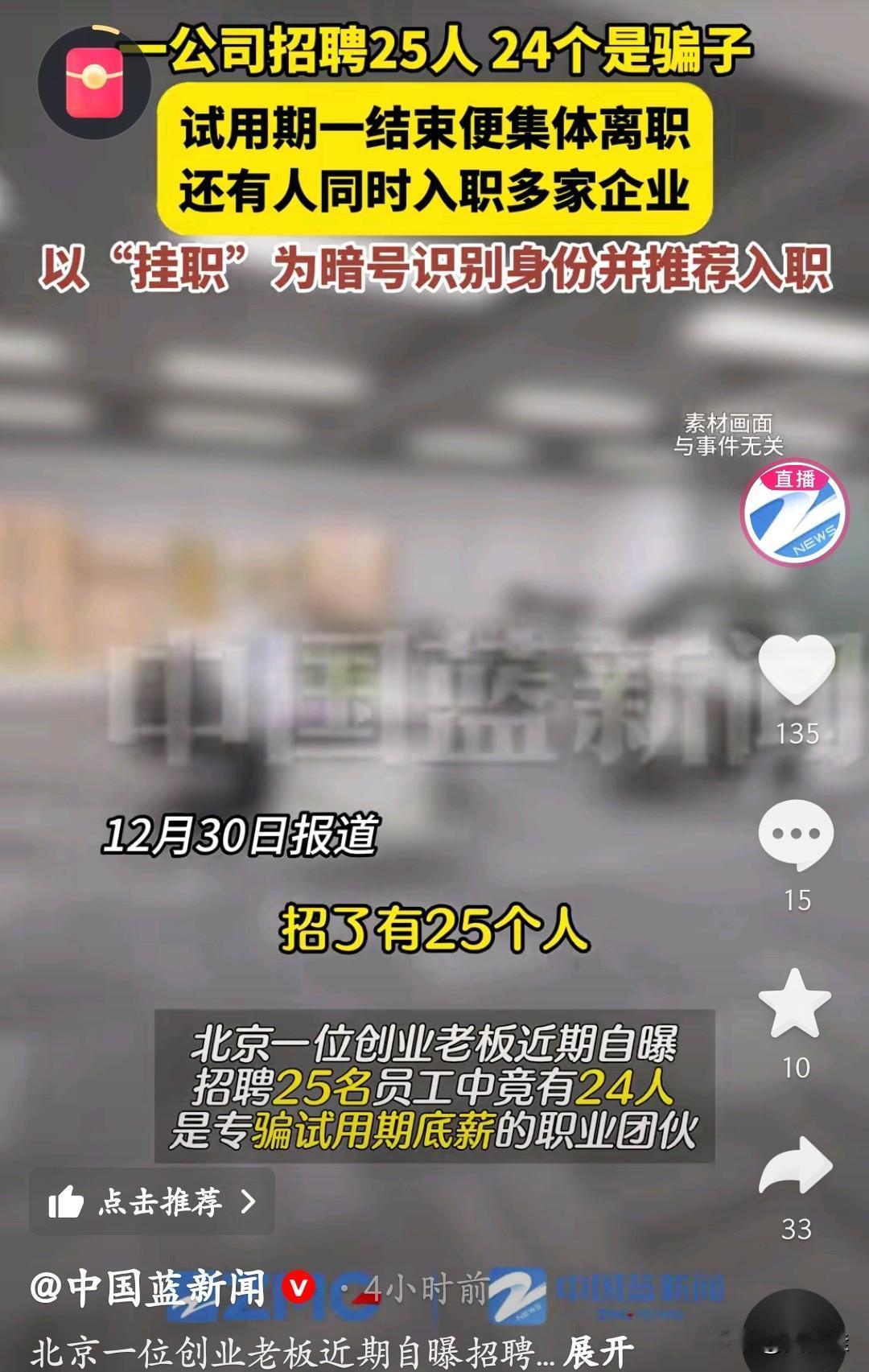 2025年最惨老板必须是北京这位创业者!招25个人,24个全是骗底薪的骗子,这概率简直离谱到家了! 这帮人还搞团伙作案,用“挂职”当黑话互相认人,甚至列了“好骗公司清单”,专挑管理松的企业薅羊毛。更气的是他们一人同时入职好几家,还主动说不要社保只拿底薪,假装很懂事,试用期混完就集体跑路,只留老板一个人对着空工位傻眼。 钱亏了不说,招聘的时间精力全打水漂,还让本来就难的招聘就业更卷了,这波踩坑真的隔着屏幕都替他心梗!