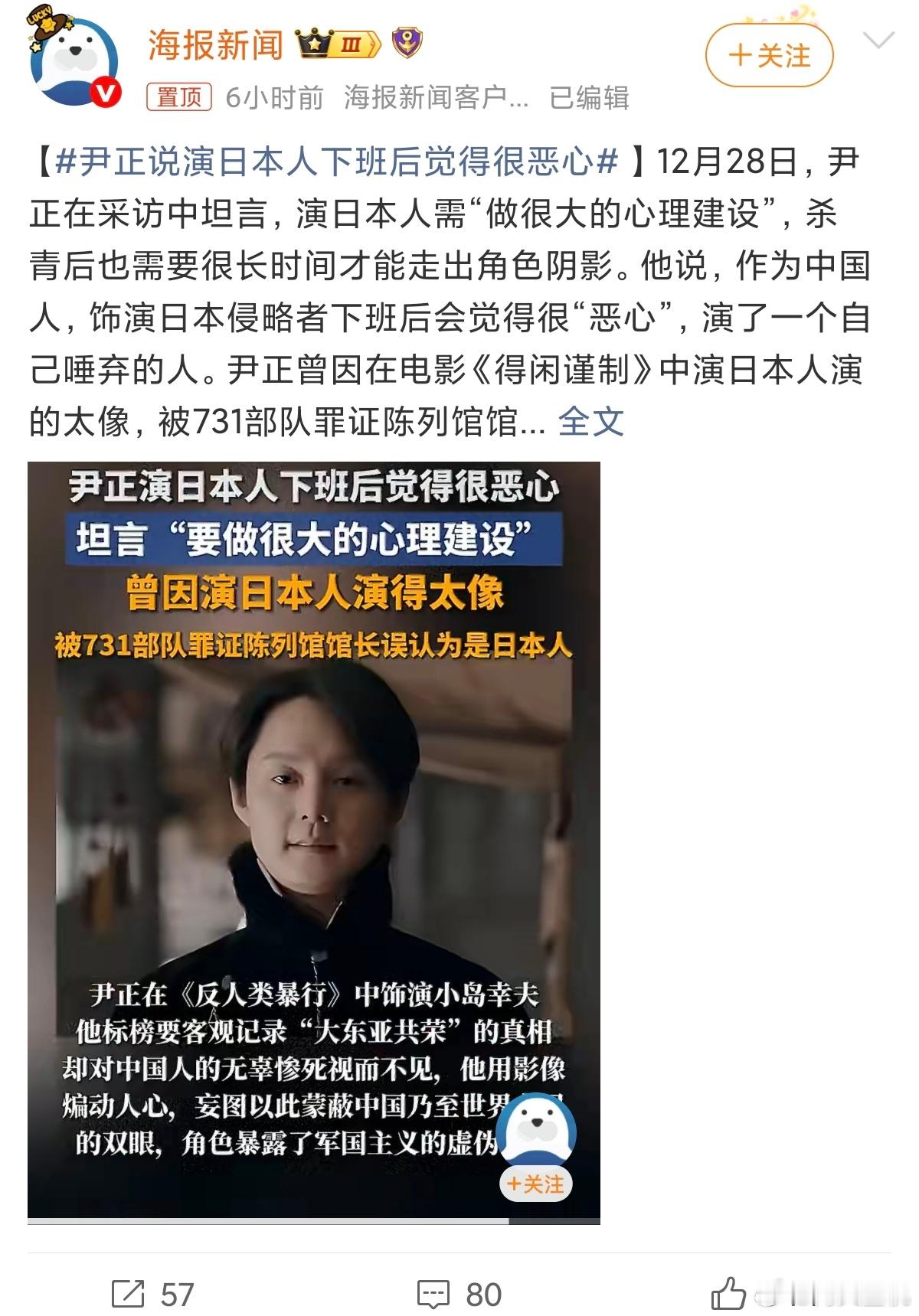 尹正说演日本人下班后觉得很恶心虽说如此,但有一说一,尹正演的日本人是真像,不知道