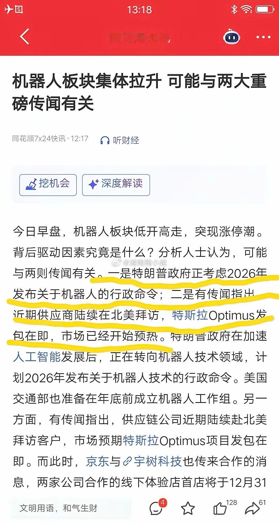 人形机器人重大利好即将来袭不少散户一头雾水,明明没啥利好消息为什么人形机器人走势这么强呢就在明年年初,有两大催化事件:一,特朗普政府正考虑于2026年,发布关于机器人的行政命令。二,特斯拉Optimus发包在即,市场已经开始预热了。要知道市场的反应是最灵敏的,有点风吹草动,资金就会跃跃欲试。如果以上两个事件顺利出台,那么人形机器人,必然是王者归来。
