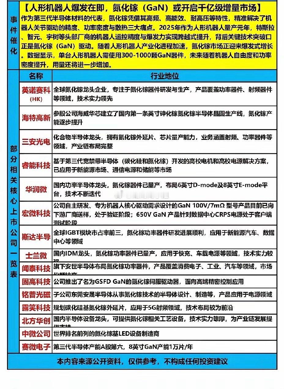 12月31日,周三A股这个板块有望大涨!!!人形机器人今日大爆发,后市前景一片光明,作为第三代半导体材料的代表,氮化镓凭借其高频、高能效、耐高压等特性,精准解决了机器人关节驱动的精度、功率密度、与散热三大难点,2025年作为人形机器人量产元年,特斯拉、宇树、紫源、智元等头部厂商的机器人运控精度与爆发力实现跨越式提升,重点关注:三安光电、斯达半导、露笑科技!!!