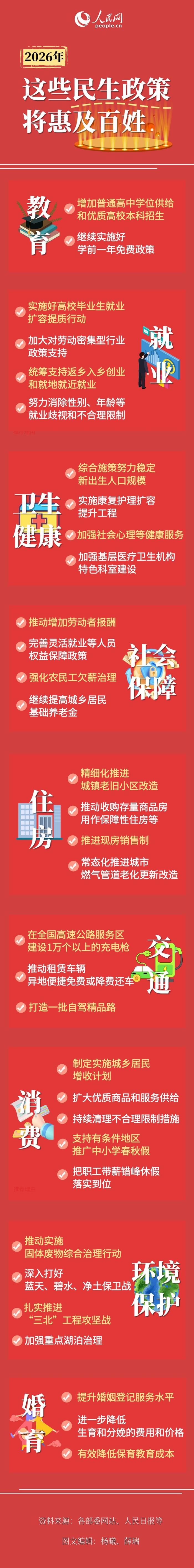 2026年民生政策大礼包来了!人民网梳理的这些利好,每一条都戳中咱老百姓的日常✨ 教育上增高中学位、续学前一年免费;就业消除性别年龄歧视,支持返乡创业;住房推进现房销售、老旧小区改造,还收存量房做保障房。 高速服务区要建1万+充电桩,租车异地还车更省钱;养老金继续涨,农民工欠薪也严治。 医疗、交通、消费、环保全有新动作,从上学就业到住房养老,从出行消费到健康保障,政策把民生的方方面面都考虑到了。 2026,日子的幸福感又多了不少盼头!