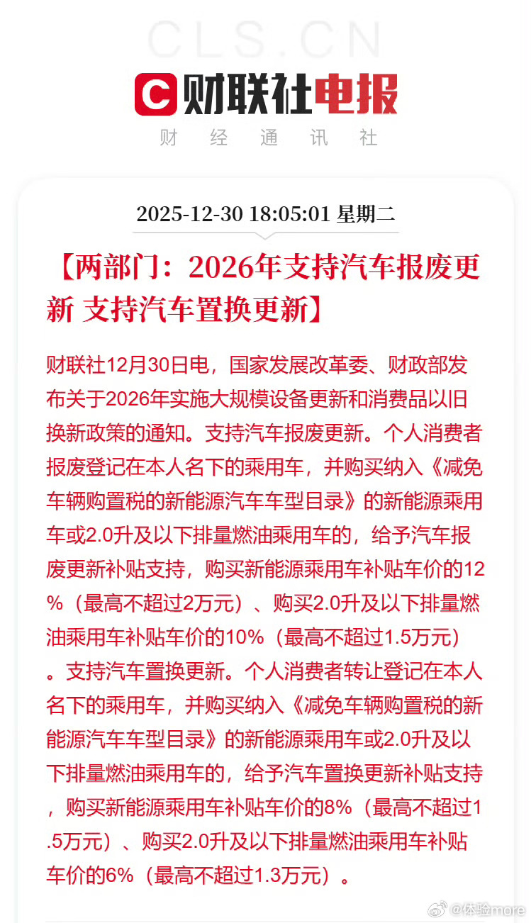 消费者购买手机等补贴15%和2025年政策一样:2026年买手机、平板、智能手表手环、智能眼镜等4类产品,按销售价格的15%给予补贴(单件销售价格不超过6000元),每件补贴不超过500元。我之前首发买小米17 Ultra徕卡版的时候还犹豫要不要等补贴,看来不用等。新能源汽车是,报废补贴不超过2万,置换补贴不超过1.5万。