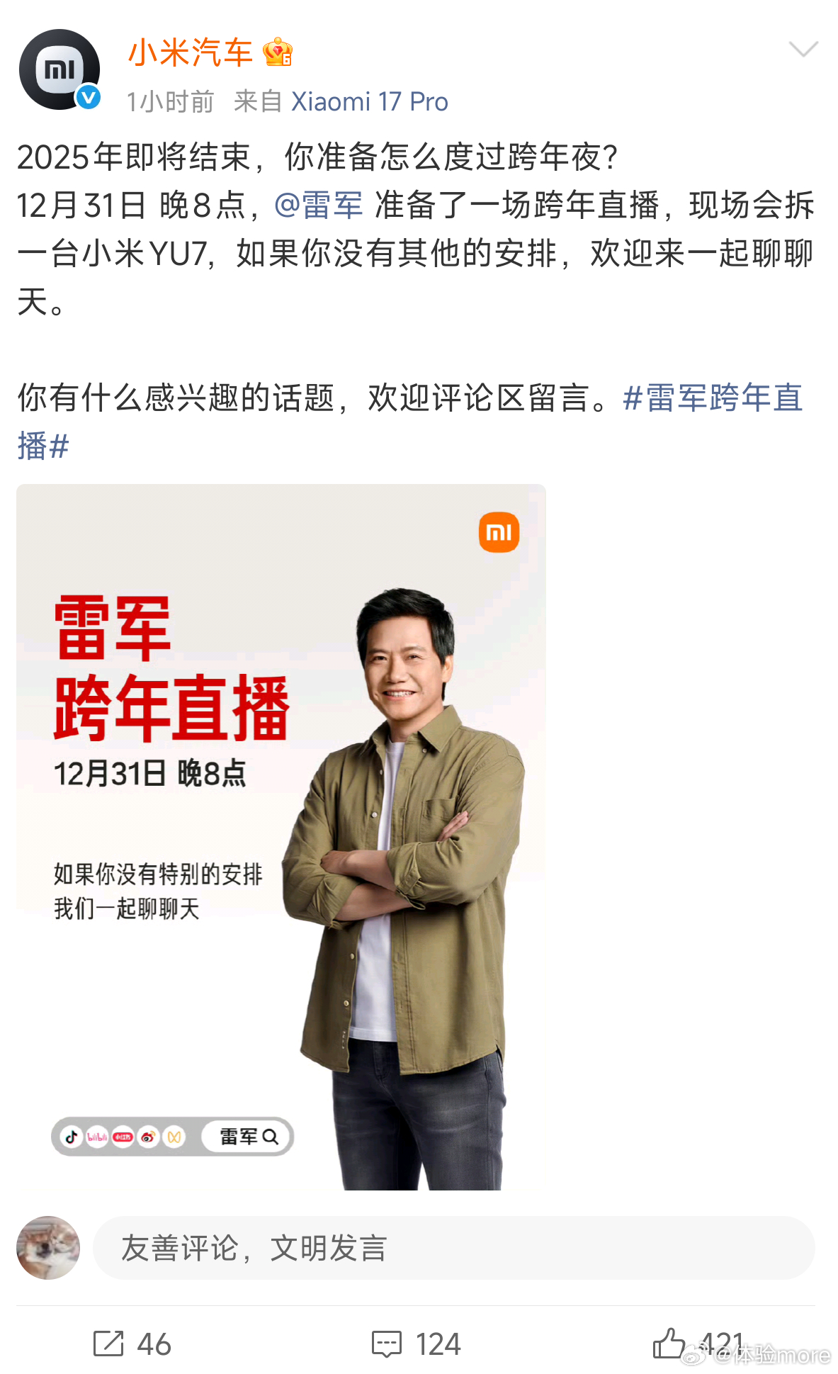 雷军跨年直播拆车雷总又跨年直播了,而且这次会现场拆一台YU7,边拆边讲,让网友直观感受一下小米YU7的用料和做工,以及为什么要这么设计。这就相当于一节免费的汽车公开课了,我作为YU7车主肯定是要看的,期待。其实直播拆解需要更大的底气和自信,雷总还是希望大家看到他的产品,他也乐意把产品“掰开揉碎”讲给你听。当然小米汽车在行业内出了名的不怕拆不怕比。不知道会不会公布2026年小米汽车新的交付目标。去年就是在跨年直播里公布2025年的交付目标是30万辆,后来增加到35万辆,已经超额完成。