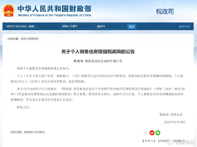 #个人出售2年以上住房免征增值税#【关于个人销售住房增值税政策的公告】个人(不含个体工商户中的一般纳税人,下同)将购买不足2年的住房对外销售的,按照3%的征收率全额缴纳增值税;个人将购买2年以上(含2年)的住房对外销售的,免征增值税。 本公告自2026年1月1日起施行。《财政部 国家税务总局关于全面推开营业税改征增值税试点的通知》(财税〔2016〕36号)附件3《营业税改征增值税试点过渡政策的规定》第五条第一款同步停止执行。2026年1月1日前,个人销售住房涉及的增值税尚未申报缴纳的,符合本公告规定的可按本公告执行。(新华社)#购买2年以上住房销售免征增值税##增值税#