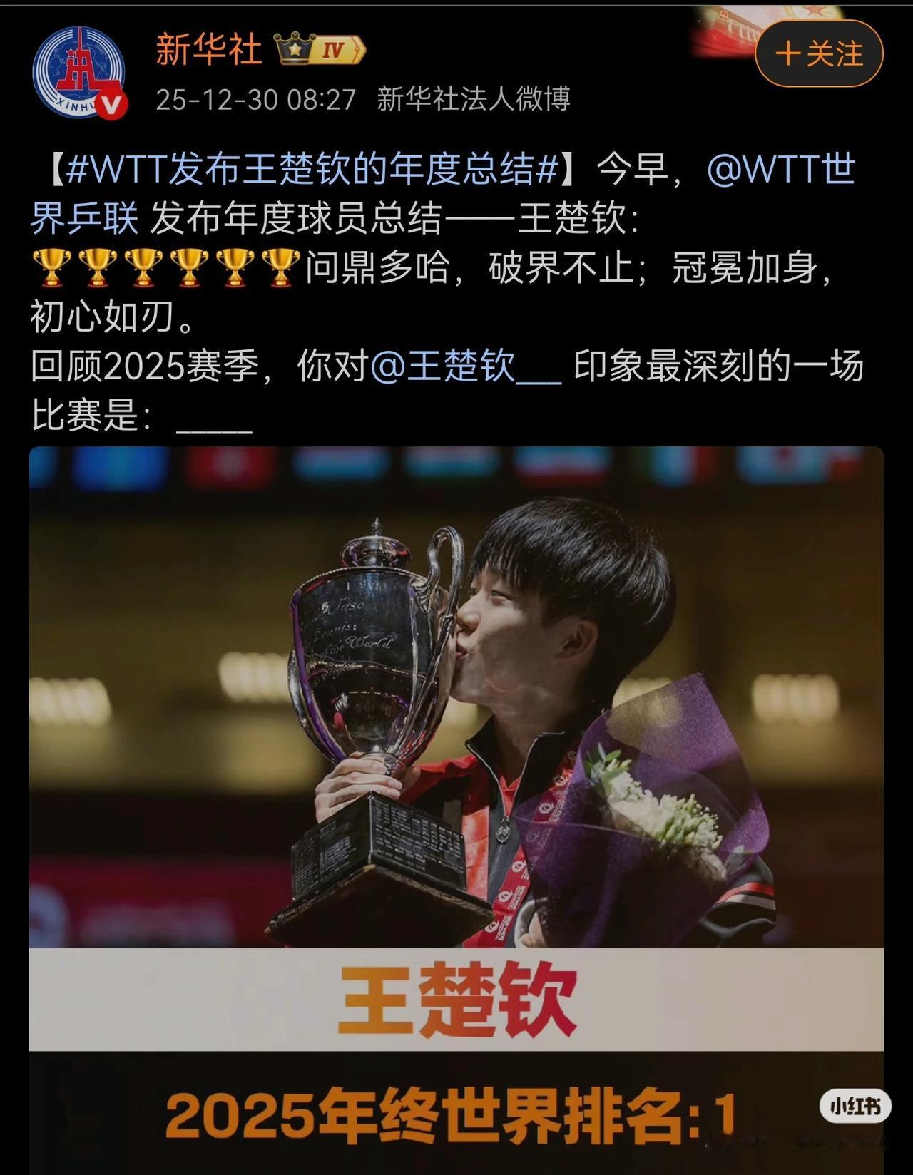 王楚钦!2025太强大!2026会更优秀![赞][赞][赞] 福冈的碾压,重庆的释放,世界杯逆转西蒙,北满半决赛的坚韧,决赛的绝对控制,港总的逆转,亚锦赛的“再来…… 太多太多!我们紧张了一次又一次,泪崩了一回又一回!庆幸自己这一年的比赛都没错过,也算是陪伴了! 王楚钦,2025年不负团队,不负自己! 残血的北满身兼三项,皆夺冠军!三冠王!谁能做到!? 坎坷又幸福的多哈!混双开始拍子坏了,单打西蒙开局落后两局到逆转[赞]新王的诞生! 楚钦的2025年,领军中国男乒,拼劲自己的全部! 时代的先锋,青年的榜样!致敬我们的狮子王![赞][赞][赞] (有人总是黑他,说白了就是嫉妒他的成绩是你几代人都够不着的高度!不喜欢的请绕行!我喜欢我就夸!)