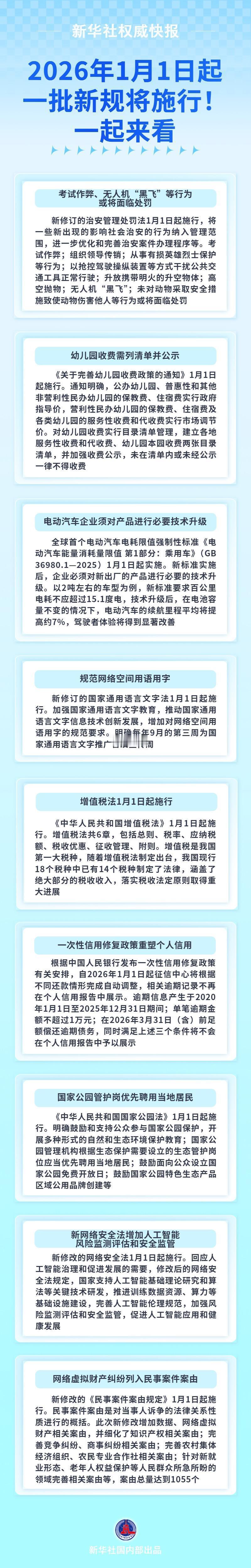 2026年1月1日起,一大批民生新规正式落地!件件都戳中咱的日常生活,太实用了✨ 治安管理更严格,高空抛物、无人机黑飞、遛狗不牵绳都有明确处罚,还手自卫不再算互殴,正当防卫有了保障;个人征信能修复小额逾期,网络用语用字也有规范。 还有幼儿园收费、电动汽车新标准、税收立法、网络安全、国家公园保护全更新。 新规全是冲着民生痛点来,规范乱象也守住权益,既给生活划好安全边界,又添了满满安全感。新的一年,日子更有章法,安稳又舒心!