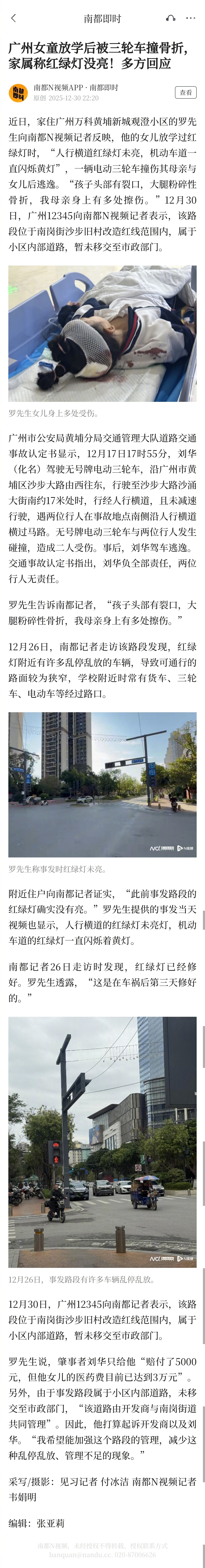 #女童过马路被撞家属称红绿灯没亮#【广州女童放学后被三轮车撞骨折,家属称红绿灯没亮!多方回应】#多方回应女童过马路被撞骨折#近日,家住广州万科黄埔新城观澄小区的罗先生向南都N视频记者反映,他的女儿放学过红绿灯时,“人行横道红绿灯未亮,机动车道一直闪烁黄灯”,一辆电动三轮车撞伤其母亲与女儿后逃逸。“孩子头部有裂口,大腿粉碎性骨折,我母亲身上有多处擦伤。”12月30日,广州12345向南都N视频记者表示,该路段位于南岗街沙步旧村改造红线范围内,属于小区内部道路,暂未移交至市政部门。广州市公安局黄埔分局交通管理大队道路交通事故认定书显示,12月17日17时55分,刘华(化名)驾驶无号牌电动三轮车,沿广州市黄埔区沙步大路由西往东,行驶至沙步大路沙涌大街南约17米处时,行经人行横道,且未减速行驶,遇两位行人在事故地点南侧沿人行横道横过马路。无号牌电动三轮车与两位行人发生碰撞,造成二人受伤。事后,刘华驾车逃逸。交通事故认定书指出,刘华负全部责任,两位行人无责任。罗先生告诉南都记者,“孩子头部有裂口,大腿粉碎性骨折,我母亲身上有多处擦伤。”12月26日,南都记者走访该路段发现,红绿灯附近有许多乱停乱放的车辆,导致可通行的路面较为狭窄,学校附近时常有货车、三轮车、电动车等经过路口。附近住户向南都记者证实,“此前事发路段的红绿灯确实没有亮。”罗先生提供的事发当天视频也显示,人行横道的红绿灯未亮灯,机动车道的红绿灯一直闪烁着黄灯。南都记者26日走访时发现,红绿灯已经修好。罗先生透露,“这是在车祸后第三天修好的。”