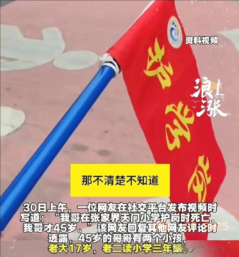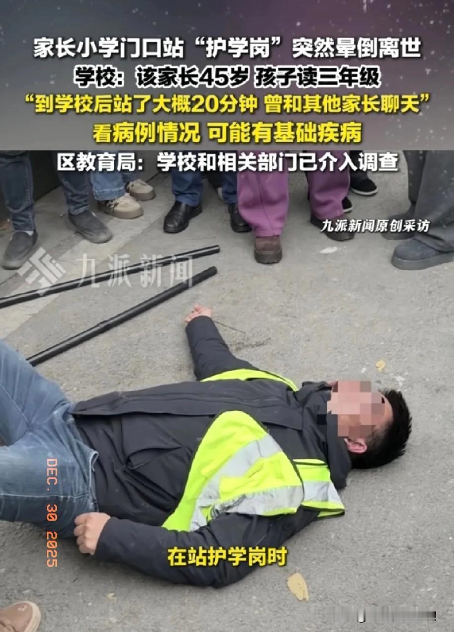 心痛! 45岁父亲在护学岗站了20分钟就晕倒了,后来再也没醒来,孩子才读二年级,这个孩子需要的是父亲陪伴成长,而不是失去父亲的痛苦回忆。 一个家庭失去了顶梁柱,这个家就散了。这么多年的付出,换来的却是悲剧的结局。 这起事件本不应该发生,父亲本能的保护孩子安全,家长本应该是辅助孩子成长的,而不是成为主要承担者。 护学岗本是学校与社会合作的产物,为的是给孩子们营造一个安全的上下学环境。 既然是社会出资的,那就应该有专业的人来做这件事,或者有专业的人来指导家长怎么做这件事,而不是让家长单方面付出,还要承担这么大的责任。 孩子上下学的安全问题,应该是学校与社会共同负责的,而不是家长单方面付出的,更不是家长来承担安全问题出现的后果。
