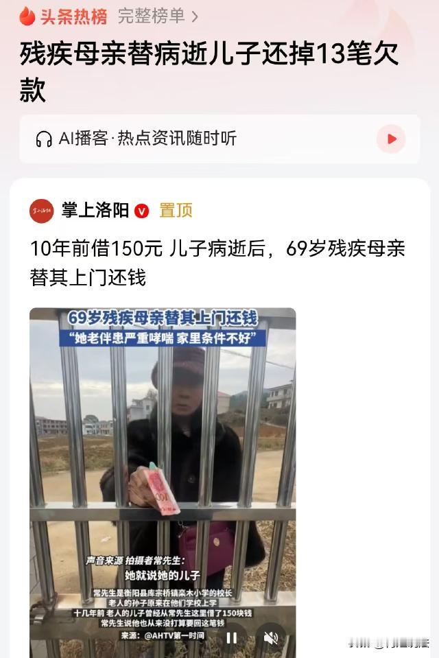 诚信抵万金!湖南衡阳,69岁独臂大娘找到常先生,说她儿子一个月前离世了,十几年前儿子借了常先生150块钱,她来替儿子还钱。常先生又惊讶又感动,通过交谈,他得知了另外一个消息。原来,大娘一个月内已经找到了13名债主,先后替儿子还了3000多元的债! 据、掌上洛阳等报道,这个感人的故事是常先生分享的,还钱的大娘是他曾经一个学生的奶奶。 据常先生讲,他是当地一所小学的校长。十几年前,大娘的孙子是他的学生。 大娘的老伴有哮喘,儿子也遗传了这个毛病,一直不能工作,家里经济非常困难。 十几年前,大娘的儿子找常先生借了150元钱。 实际上,当初这150元钱借出去的时候,常先生就从来没想过收回,十几年过去,常先生也已经将这件事忘记了。 可那天,大娘突然找到常先生,说她找别人打听到,儿子十几年前曾借过常先生150元钱,她是来还钱的。 常先生非常惊讶,连连说不用还了,可大娘接下来的一句话,直接让常先生破防了。 大娘说,她的儿子在一个月前离世了。她知道儿子以前借过别人钱,因为条件不好,很多欠款都没还。 这一个多月,大娘一直到处打听,先后找到了13个债主,一笔一笔将儿子欠下的债全部还上了。 这些人中,最多的一个还了500元,13人一共还了3000多元。 常先生知道,3000元对于别人来说不多,但是对于大娘的家庭来讲,却是一笔天文数字。 大娘失去了一只手,老伴身体还不如她,儿子和老伴一样的问题,下面还有一个小孙子。 可以说,大娘家除了她自己,其余人都需要常年花钱。 可问题是,大娘的家庭完全没有收入来源,生活过得有多艰难可想而知,这些钱哪怕大娘不还,也决对不会有人说什么。 但是,大娘过不去心里那道坎,这才到处打听,一笔一笔替儿子还债。 看着步履蹒跚的大娘,常先生说什么都不肯收,可大娘说,人死不欠前世债,只有替儿子还了这些钱,她才能心安。 为了让大娘安心,常先生收下了这150元钱。但是,常先生对大娘又同情又敬佩,转眼间他又将大娘还给他的钱塞回给了大娘。 常先生说,大娘儿子欠他的钱,大娘已经替他还上了,现在这150元钱,是他替大娘的儿子孝敬她的。 听完常先生的话,大娘哽咽着抹起了眼泪。 几天后,常先生放心不下,去大娘家拜访老两口。 大娘家的房子一看就是很多年前盖的,看起来非常破旧,有的房间墙都没粉刷,地面连水泥地坪都没打。 在大娘家,常先生看到了大娘的老伴儿,老大爷步履蹒跚,看起来非常瘦弱。 常先生再次对老两口肃然起敬,他为他们带去了一些生活物资,临走前又塞给了大娘几百元钱。 常先生临走前,老两口一直送到了门口,看着他的背影默默抹眼泪。 常先生将大娘的事发出来后,大家纷纷感叹,大娘的诚信,可抵万金! 从法律角度来看,大娘的儿子确实有还钱的义务,但是,儿子离世后,大娘并没有义务必须替儿子还钱。 《民法典》第四百六十九条规定,当事人订立合同,可以采用书面形式、口头形式或者其他形式。 大娘的儿子与债主们的借款为口头约定,但口头约定同样构成有效的借款合同关系。 根据《民法典》第五百零九条规定,当事人应当按照约定全面履行自己的义务。 所以,从法律角度讲,大娘儿子在生前有义务偿还这些债务。 大娘的儿子已经离世,那么大娘是否有义务替儿子还账呢? 《民法典》第一千一百六十一条的规定,继承人以所得遗产实际价值,为限清偿被继承人依法应当缴纳的税款和债务。超过遗产实际价值部分,继承人自愿偿还的不在此限。 大娘一家生活困难,儿子长期患 病不能工作,基本可以推断,儿子并没有留下可供继承的遗产。 所以,从法律严格规定来说,大娘并没有替儿子偿还债务的法定义务。 但是,大娘却选择了主动承担起这份责任,一个月内找到13名债主,先后偿还3000多元欠款。 大娘的行为,体现的是一种超越法律义务的道德担当和诚信精神。 常先生收下大娘还的钱后,又将钱塞回给大娘,这种行为在法律上属于赠与行为。 《民法典》第六百五十七条规定,赠与合同是赠与人将自己的财产无偿给予受赠人,受赠人表示接受赠与的合同。 常先生基于对大娘的同情和敬佩,将个人财产赠予大娘,也是对大娘诚信行为的一种肯定和回馈!