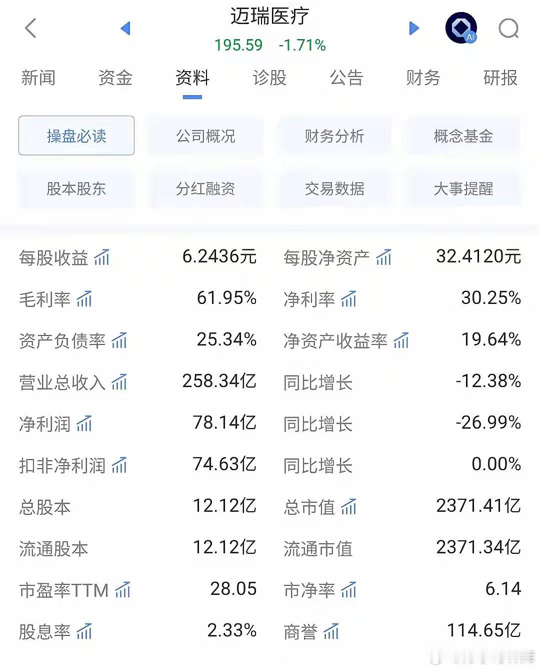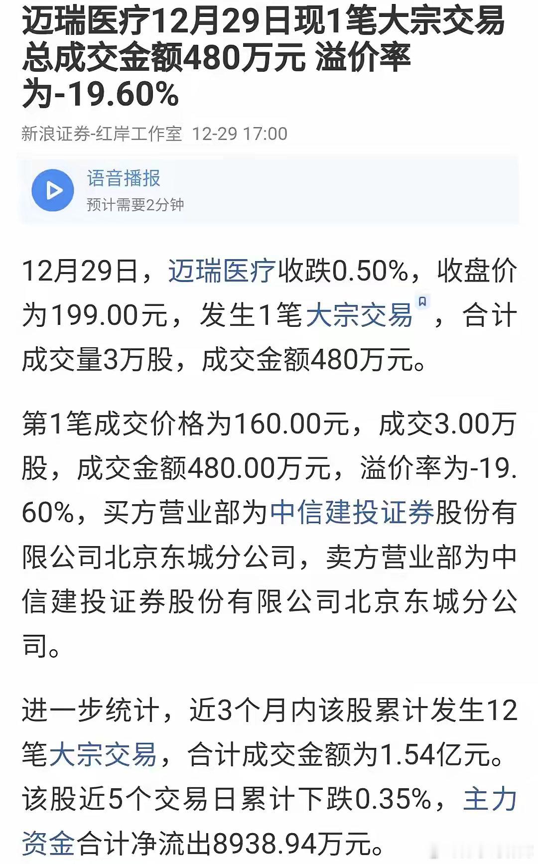 从迈瑞医疗看股市,泡沫之大跟房价有的一比(图1)。迈瑞医疗很优秀,但再好的企业被炒到天价就是坏投资。从2021年2月18日最高477元,跌到2025年12月30日的195元,不到5年时间,股价已经腰斩!但即便是腰斩后的股价,估值依旧是偏高的。一个最明显的例证就是,2025年12月29日,发生了一笔所谓的“大宗交易”(图2),大户之间场外对敲,成交价是160元,比场内二级市场低了19.6%!说明什么?说明这两个大户,买卖双方都并不看好当前的价位。由此可见,股市泡沫有多严重。迈瑞医疗下跌过程中,也曾经有过多次大尺度反弹,但每次反弹,都是出货良机。那现在跌到了195,有投资价值了吗?我们来分析其估值(见图3)。迈瑞医疗在195元的市盈率高达28倍,市净率高达6倍,股息率只有2.33%,要命的是,其营收和利润增长率竟然都是负的双位数,说明其市场正在萎缩。唯一亮点是,其毛利率高达60%,净利率高达30%,净资产收益率高达19%,足见其产品之高端和垄断地位之稳固。但即便如此,也只能说明,本领很大的迈瑞医疗,面对的是一个需求萎缩的市场,你的一身本领,已经不是市场所急需的了。有人会问,迈瑞医疗,做为顶尖的大型医疗设备器械制造企业,在人口老龄化时代,本应生意更兴旺呀,老人更需要医疗服务呀,业绩何以负增长?其实,虽然国内人口老龄化会使医疗需求增加,但社保覆盖人群的收入和消费能力却十分低下,且总体人口下降,还伴随着人口向大城市集中,导致广大三四线城市和县级医院医疗设备市场萎缩。另一方面,大城市的医疗设备市场,本身不但也已经饱和了,而且竞争也更激烈,诸多进口医疗设备供应商(如西门子之类)一样虎视眈眈,市场僧多粥少,因此,大城市医院未能补上三四线城市和县级医院市场的缺口。除了人口下降,另一个原因是,全国各级地方政府财政的拮据。迈瑞医疗生产的各类高端医疗设备的主要客户是公立医院,背后的金主则是相关地方政府。土地出让金大幅下降,导致地方政府手头拮据,迈瑞医疗的市场,也自然会萎缩。第三个原因是,迈瑞主打的,都是高端成套医疗设备,属于耐用设备,使用寿命周期至少高达10年,医院一旦采购,就不会轻易更换或增购。所以,再好的企业,也是有估值天花板的,股价被“主力”炒到了477元,非但已经透支了其所有的未来,更低估了医疗设备市场容量下降,所带来行业整体业绩萎缩。