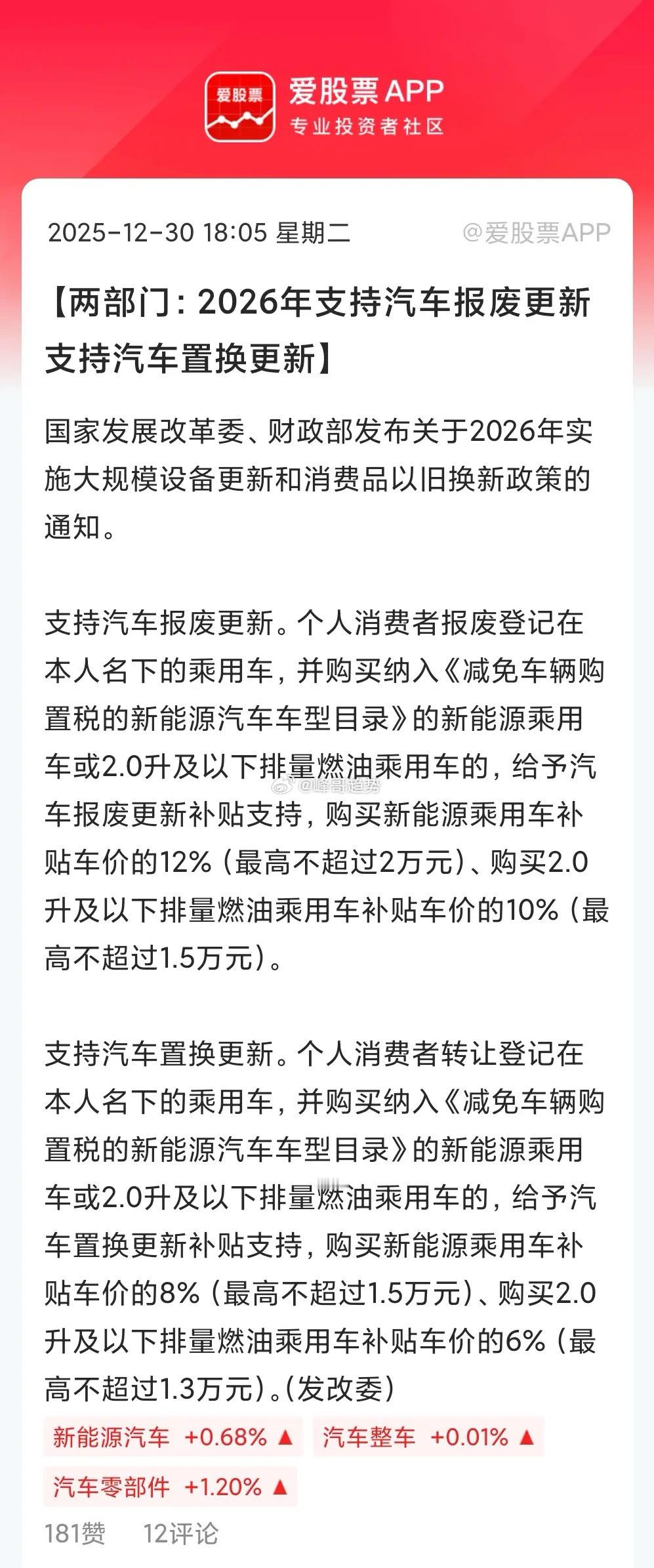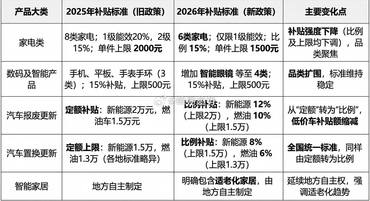 2026年国补新政落地,峰哥看了下,主要的变化有几个:1、汽车。之前是固定金额补贴,现在改为按车价比例补贴;简单理解,车价越高,补贴上限拿的越多!从比例看,以旧换新买新能源车,补贴比例8%,不超过1.5万;报废更新买新能源,补贴比例12%,不超过2万。金额跟2025差不多,不过明年新能源车要多一个购置税,整体上买车负担加重了。2、家电。只补贴冰箱、洗衣机、电视、空调、电脑、热水器这6类,必须是1级能效或水效,补售价的15%,最高1500元。2025年补贴8类家电,包括1级2级能效,很显然,家电补贴强度也下降了。3、数码智能产品:手机、平板、智能手表(手环)、智能眼镜等4类产品可补。价格6000以下、单人单件最高补500,标准没变。4、智能眼镜首次纳入“国补”。这个变化是向市场释放明确信号,“人工智能+消费”将获得政策重点支持。5、新增电梯、消防等民生设备。比如,老旧小区加装电梯、养老机构设备更新、消防救援设备更新也都是首次纳入补贴,体现了对民生的重视!总结就是,我们钱要花在刀刃上,给老百姓换车、换家电、买手机实实在在真金白银的补贴。同时对产业而言,重点是人工智能+消费、绿色消费,这也是A股2026的机会所在!对了,第一批625亿元资金已提前下达,大家元旦假期可以去买买买了。财经A股2026年国补目录