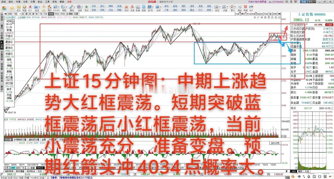 大A:变盘在即,明天还是假期后? 12月30日 大A平盘0.0%,中期上涨趋势3732-4034点宽幅震荡。短期3815点小级别上涨结构,今天探底回升,继续是3970-3983点小震荡,当前震荡已经充分,具备冲击4034点能力。从板块题材角度看,强势的板块方向小震荡也充分,具备上冲能力。抛开小假期看,明天就要变盘,这个上冲就关注能否过了4034点并回踩确认住。主观预期应该是突破过去。 科创50上涨1.01%,中期上涨趋势宽幅震荡。短期1286点小级别上涨趋势1331-1367点小震荡,今天震荡再创小新高,明天向上突破概率大,一旦过了1360点回踩确认住,短期进一步走强。如果冲不上去,短期相对弱势,不是调整下去,就是放宽震荡。 创业板上涨0.63%,中期上涨趋势2892-3331点区间震荡。短期3058点小级别上涨趋势3190-3268点小震荡,当前已震荡充分,随时变盘,向上冲击概率大。如果跌穿3190点,则要往下变盘,短期相对弱势,要么调整下去,要么放宽震荡。 沪深300上涨0.26%,中期上涨趋势宽幅震荡。短期4484点小级别上涨趋势的4602-4676点小震荡。今天探底回升,下不去,震荡已充分,随时有向上突破概率大。防守位3190点,跌穿了,拉不上来,短期相对弱势,没那么快上涨。 今天领涨的题材概念:电机、影视院线、人形机器人、石油加工贸易、PEEK材料、自动化设备、同花顺果指数、青海、汽车热管理、汽车零部件、中国AI 50、快手概念、工业母机、同花顺新质50、新型工业化、短剧游戏、C2M概念、长安汽车概念、消费电子、液冷服务器、工程机械、华为盘古、农机、通用设备、拼多多概念等。今天领涨主要是人形机器人,还有部分算力方向和消费电子。明天或假期后上证指数应该会变盘,主观预期应该是人形机器人、算力、消费电子、军工等带领上证指数突破4034点。这板块小震荡也充分了,军工方向也突破回踩确认住,具备上冲进一步走强能力。中期跟踪情况:1、消费电子上涨0.97%,中期上涨趋势10485-12087点区间震荡。短期10878点小级别上涨趋势11580-11797点小震荡结构。今天探底回升,略破11580点,迅速拉上来小创新高,小震荡已充分,随时冲击12087点。目前看直接大涨突破12087点概率不大,还会围绕12087点收窄震荡,震荡充分再突破。如果再破11531点,短期没那么上涨。2、半导体上涨0.35%,中期上涨趋势宽幅震荡。短期11312点小级别上涨趋势的11964-12218点小震荡,今天进一步收窄震荡,随时有变盘可能,预期向上突破概率大。如果跌穿11964点,反拉上不去,短期往下变盘,12218点是短期高点,小级别下跌结构。3、证券下跌0.11%,中期上涨趋势宽幅震荡。今天震荡下跌,短期弱势震荡,再创小新低概率大。需要过1670点回踩确认住,才有进一步走强可能。4、低空经济下跌0.16%,中期上涨结构,刚突破1994-2210点震荡,在震荡上方小震荡。短期2052点小级别上涨结构,今天小冲高回落,继续2200-2246点小震荡,预期再震荡1、2天会向上突破。如果跌穿2200点,反拉上不去,则回到1994-2210点震荡,短期没那么快突破。5、军工装备下跌0.68%,中期刚突破震荡后的上涨结构。短期2294点小级别上涨结构,今天冲高回落,接下来2500-2598点小震荡,需要震荡1、2天后向上冲。如果跌穿2500点,反拉上不去,回到2144-2502点震荡,短期相对弱势。6、元件下跌0.84%,中期上涨13269-15768点区间震荡。短期14343点小级别上涨趋势的15128-15583点小震荡,酝酿突破前面15527小高点的小震荡,明天小下探,再反弹上来,随时准备突破。如果跌穿15128点,小反拉上不去,短期没那么快上冲,15583点是短期高点。7、保险下跌1.26%,中期上涨结构, 在大震荡上沿高点收窄小震荡。今天震荡下跌,略破2449高点,继续2406-2528点小震荡。明天小下探,能拉上来,继续当前小震荡,随后上冲概率大。如果跌穿2406点反拉上不去,短期没那么快上涨,要么调整下去,要么放宽震荡。短期跟踪情况:A、短期关注强势的商业航天及军工、航空发动机等相关板块,轮动节奏。商业航天再小上冲后应该会开始调整。B、这2天强势异动的人形机器人(PEEK材料)、算力(PCB、CPO\铜缆高速连接、液冷服务器等),特别是算力各个细分保持短期强势小震荡,具备进一步走强能力。A股指数A股行情A股回升今日看盘