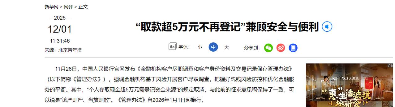 好消息!钱存银行的人要乐开花了,从2026年1月1日起,不管你存还是取,只要个人存取现金≥5万元,不用再强制登记资金来源和用途,仅需完成身份核验即可办理。 (阅读前请点个赞,点个关注,主页有更多你喜欢看的内容) 那些经常用大额现金周转的个体户、需要应急用钱的普通家庭,还有习惯用现金的老年人,终于不用再为存取自己的血汗钱“自证清白”了。 这可是监管部门放下“一刀切”的粗放管理,换成精准服务的民生大动作,既懂老百姓的难处,又守住了金融安全的底线。 过去那套“5万登记”的规矩,执行起来确实有点折腾人。 2022年开始推行的这项规定,本来是为了反洗钱、防诈骗,可架不住有些银行“层层加码”,把好事办得变了味。 江苏有位张阿姨,去年中秋想取6万退休金给晚辈包红包、办年货,钱是每月按时到账的养老金,可到了银行,工作人员反复盘问用途,还让她翻出养老金到账记录佐证,解释了半天才拿到钱。 而且有些网点为了怕担责,悄悄把登记门槛降到1万、2万,取点生活费都要被问东问西,让人感觉自己的钱反倒不自由了。 这些真实遭遇不是个例,2024年媒体统计,银行这类现金业务投诉里,个体户和中老年人占了七成,核心就是流程太繁琐、盘问太随意。 而这次新规的落地,彻底终结了这种尴尬,背后是三大监管部门的务实担当和精准考量。 今年11月28日,有关部门明确取消“个人存取现金超5万元需登记资金来源和用途”的规定,这不是银行临时变通,而是全国统一的硬规矩。 更关键的是,新规是参考了北京、厦门、杭州等多个城市的试点经验,试点数据表明:大额现金业务办结效率提升35%,当场办结比例从81.3%涨到96.8%,投诉率直接降了60%。 厦门有位朋友10月取8万块给弟弟交学费,本来准备带缴费单,结果银行只核对了身份证和工资流水,5分钟就办完,比以前省了一半时间。 这说明便民政策只要找对路子,就能既省心又高效,监管部门显然看到了这一点,才果断在全国推广。 很多人担心,取消登记会不会给不法分子钻空子,咱只管把心放肚子里,新规是“减流程”不是“松监管”,而是从“无差别管控”升级成“精准风控”,这才是监管的大智慧。 过去是不管谁存取5万以上,都要填表格、做登记,把98%的合法交易和2%的可疑交易混为一谈,既耽误普通人时间,又分散了监管精力。 现在不一样了,银行靠大数据、AI系统给交易做“风险画像”,对老实人一路绿灯,对可疑行为紧盯不放。 比如每月固定领工资、取养老金的上班族和老人,流水稳定、交易规律,属于低风险客户,刷个身份证、做个人脸识别,几分钟就能办完业务。 但如果一个平时每月流水只有几千块的账户,突然取20万现金,或者短时间内频繁大额进出、和高风险地区有资金往来,银行就会启动强化调查,核实资金来源和用途,这既是防诈骗,也是在保护账户主人的资金安全。 今年上半年,银行靠智能风控已经拦截12.3万笔可疑交易,保住了86亿元资金,这说明精准监管比“一刀切”管用多了,既没给坏人可乘之机,又没给好人添堵。 这次新规最受益的,就是那些真正需要大额现金的群体,实实在在解决了他们的痛点。 开水果店的陈老板每月要取10万现金进货,以前每次都要带营业执照、进货台账,跟柜员解释半天“钱要进什么水果”,旺季时一天存两笔现金,光在银行就要耗1个多小时。 新规实施后,只要账户流水和经营规模匹配,带身份证和银行卡就能办,省下来的时间能多理一批货。 而且新规明确禁止银行“层层加码”,不能再随意降低登记门槛,要是遇到网点违规要求填登记表格、强制要额外证明,完全可以拒绝,还能打12363金融消费投诉热线维权,这就给老百姓的合法权益上了双保险。 不过以后大额取现还是要提前预约,银行现金储备有限,5-10万建议提前1天,20万以上提前3天,手机银行就能操作,不用跑网点。 但银行客户身份及交易记录保存期限,从5年延长到了10年,这进一步筑牢了追溯防线,让违法分子无机可乘,也让大家的资金安全更有保障。 如此看来,这笔存取款的“减法”,其实是民生服务的“加法”,更是监管智慧的“乘法”。 它尊重了普通人“存取自有资金的自由”,让金融服务回归了“为老百姓服务”的本质,而不是给老百姓添堵。 过去那种“自己的钱取出来还要反复解释”的日子一去不复返了,这是国家对老百姓合法权益的重视,是金融监管从“粗放”到“精准”的进步。 2026年1月1日,这个新规就正式落地了,咱们只要守规矩、合法使用资金,不用再担心被不必要的流程折腾。 而那些想靠拆分交易、冒用账户搞违法活动的人,也别想钻空子,好政策就是这样:该方便的绝不麻烦,该严格的绝不放松,既让老百姓省心舒心,又守住了金融安全的底线,这样的政策,咱老百姓举双手赞成。 信源:新华网