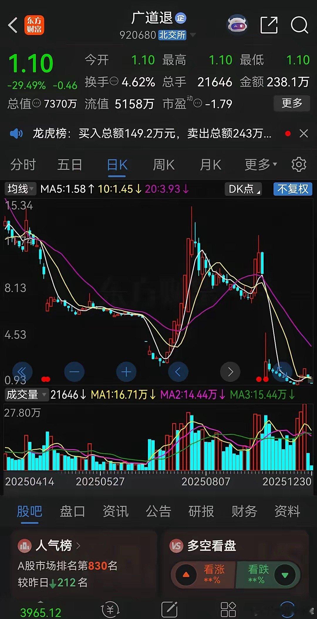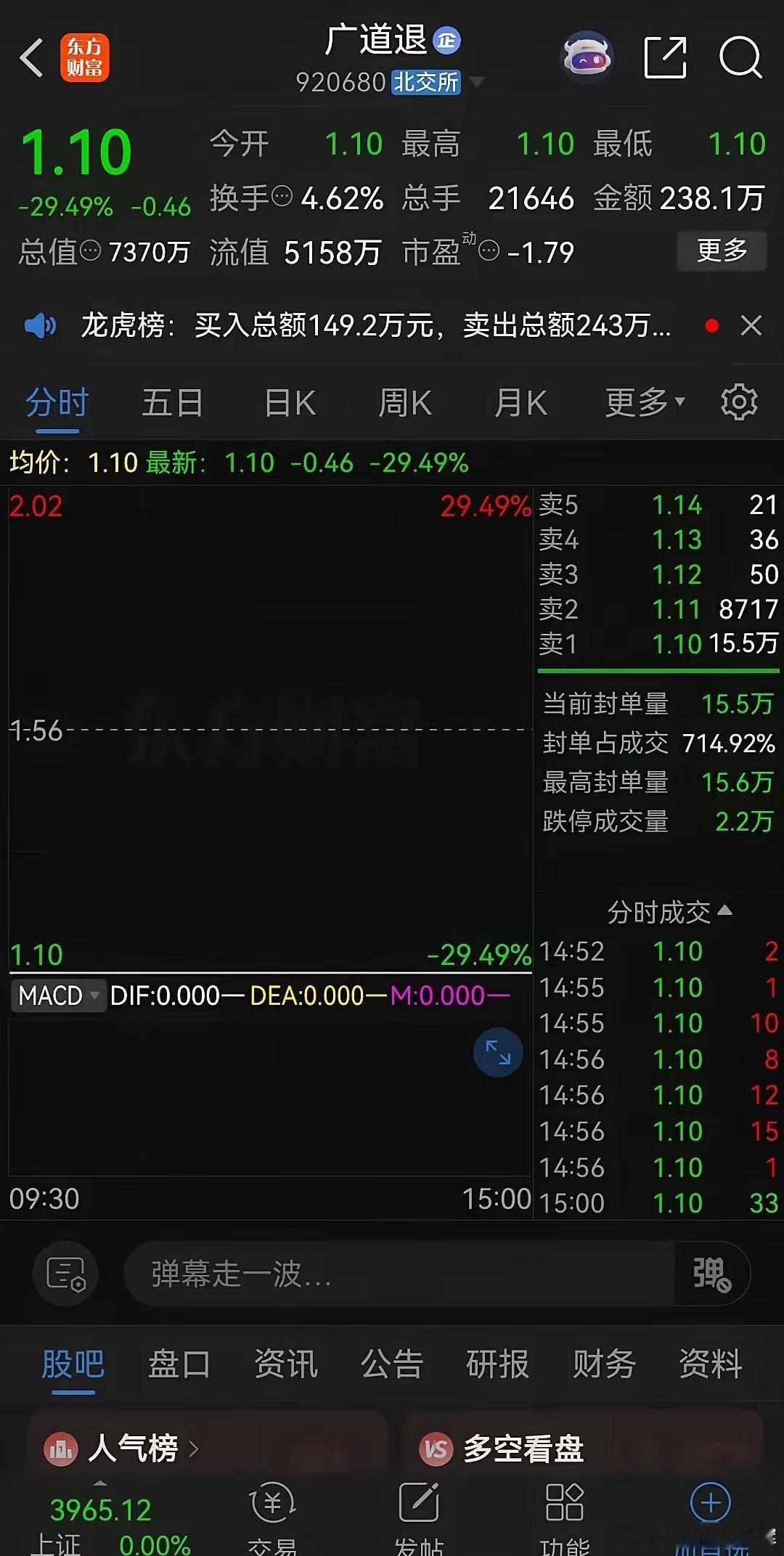 全被一锅端!还有1天退市,今天30厘米一字跌停!广道数字这次又给股民们深深地上了一课。公司因涉嫌重大财务造假被强制退市,进入退市整理期的第一天大跌71%,股价报收于2.75元,此后又连续下跌8天,股价一度跌破1元面值,本以为就这样退市了。没想到在股价跌到0.93元时,突然暴力拉升,强势涨停,而且连续三天涨停,因为是北交所的股票,一个涨停就30%,这3个涨停直接让股价翻了1.5倍,在巨大的赚钱效应面前,不少股民还是没能抵挡住诱惑,纷纷冲了进去。然而此时离退市仅剩下三天时间。昨天广道数字大幅低开后闪崩跌停,今天又是一字跌停,截至今天收盘股价报收于1.10元,跌停板上仍有封单15.5万手。之前没走掉的股民全部被一锅端了,明天如果再不开板,这就意味着前几天看着大涨冲进去的股民将陪着公司一起退市。现在回头看,那突然拉出的三个30厘米涨停,就是一个回光返照,专门引诱贪婪的股民进场来“陪葬”的。