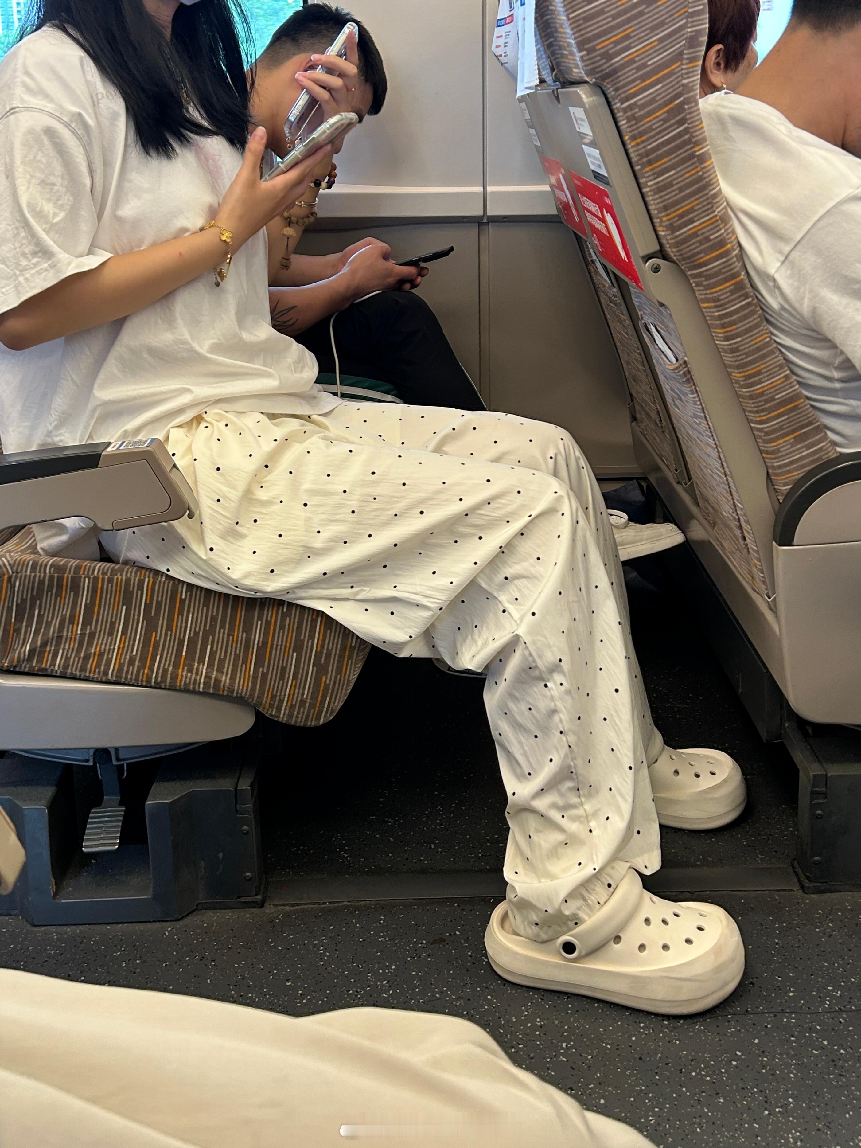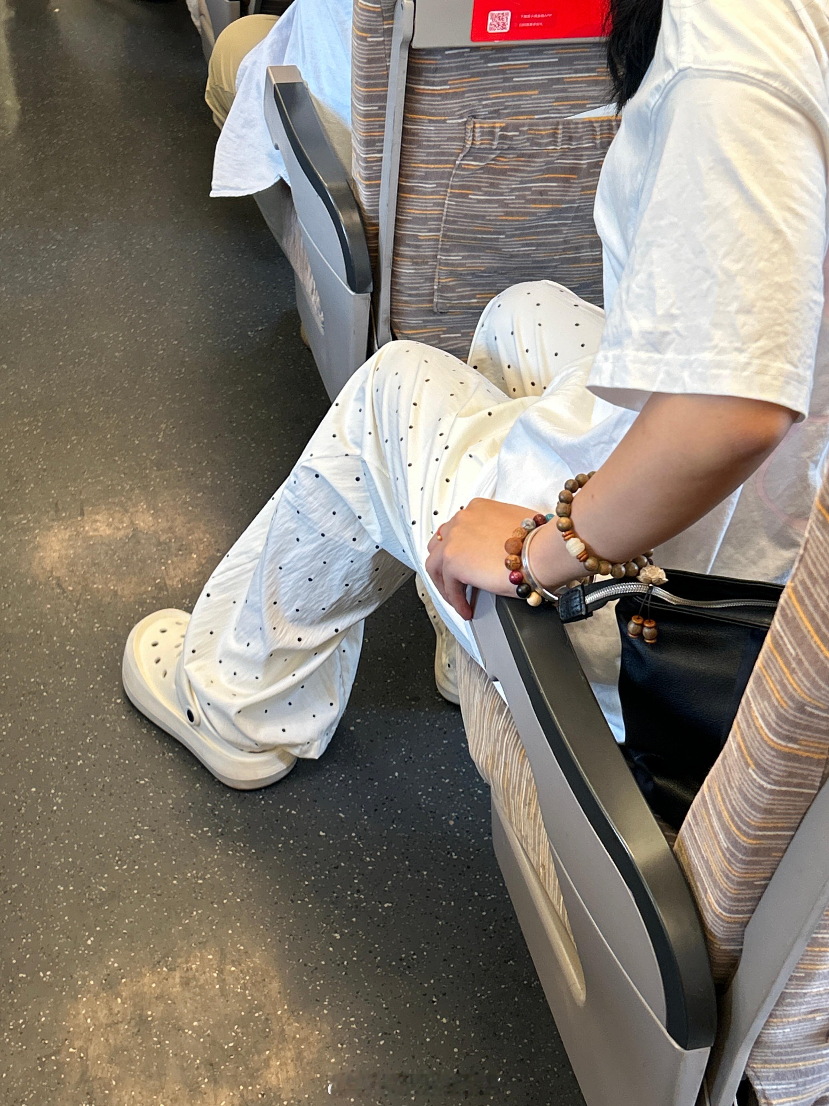 无语了, 高铁看到的…服了我自己了,本来对这种波点元素不感冒的,但是看到小姐姐这么穿,感觉好喜欢这种简简单单的cleanfit呀,短袖➕波点裤➕洞洞鞋,日常又百搭,i人当时没好意思去要链接现在来求网友了