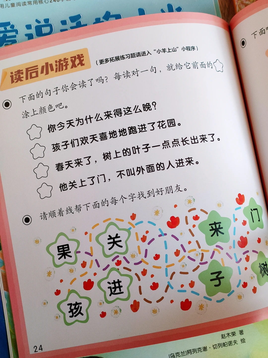 👨👦之后的每一个夜晚,儿子都会很主动很自律的看半个小时电视后,取一册小羊上山来到我身旁,我看书,他也看书。尤其是书后小游戏那个环节,他也很感兴趣,帮每个字找好朋友,图片文字对应句子连接,他不仅做对了,还要在我跟前显摆一下他的全对。