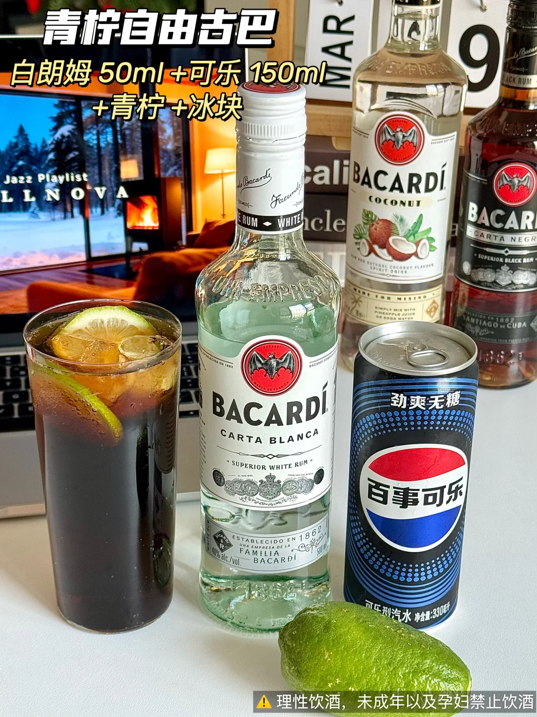 白朗姆 50ml ➕可乐 150ml➕青柠 ➕冰块