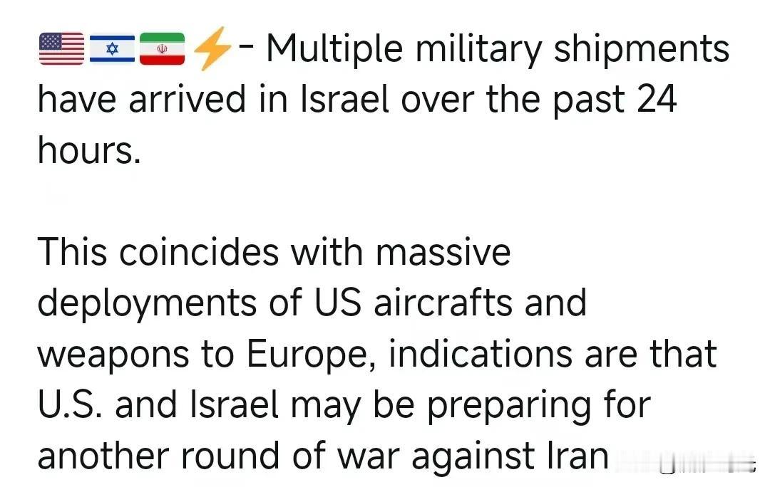 过去24小时内,多批军用物资抵达以色列。与此同时,美国向欧洲大规模部署飞机和武器,种种迹象表明,美国和以色列可能正在为新一轮针对伊朗的战争做准备。以色列