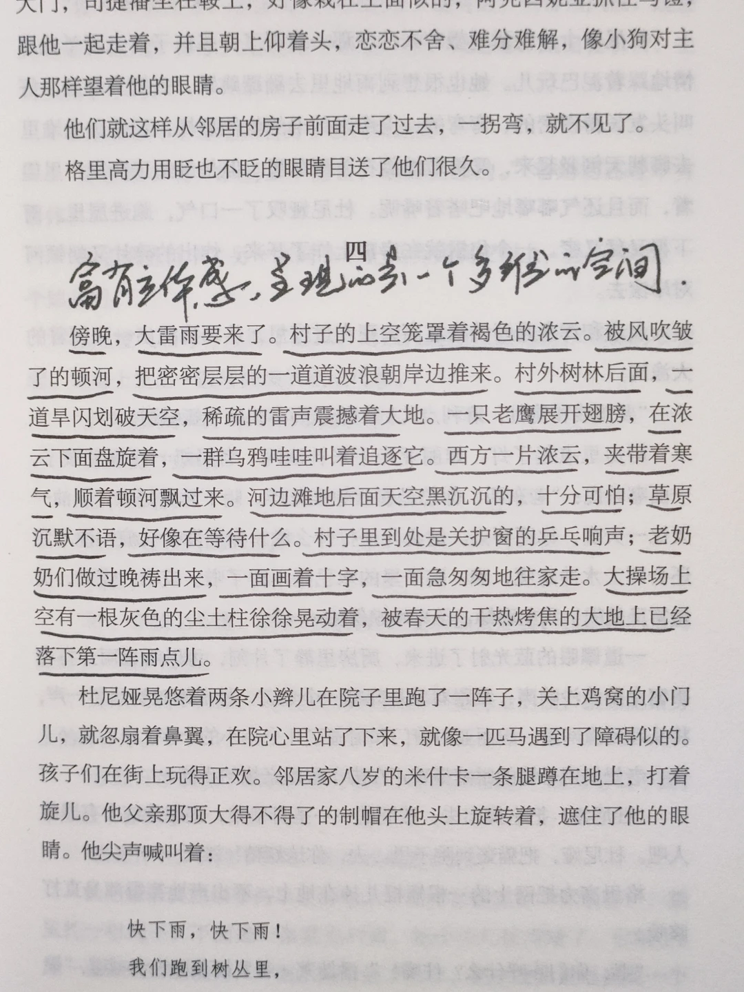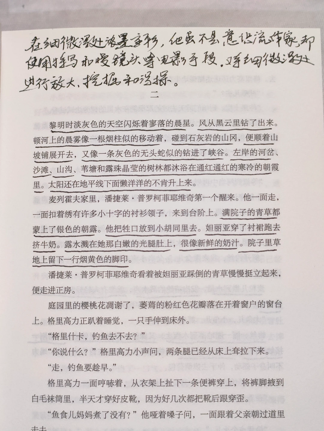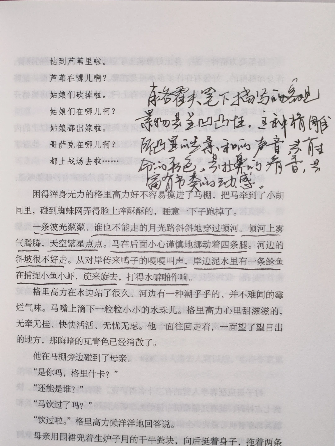 “一条波光粼粼、谁也不能走的月光路斜斜地穿过顿河。顿河上雾气腾腾,天空繁星点点。马在后面小心谨慎地挪动着四条腿。河边的斜坡很不好走。从对岸传来鸭子的嘎嘎叫声,岸边泥水里有一条鲶鱼在捕捉小鱼小虾,旋来旋去,打得水劈啪作响。”