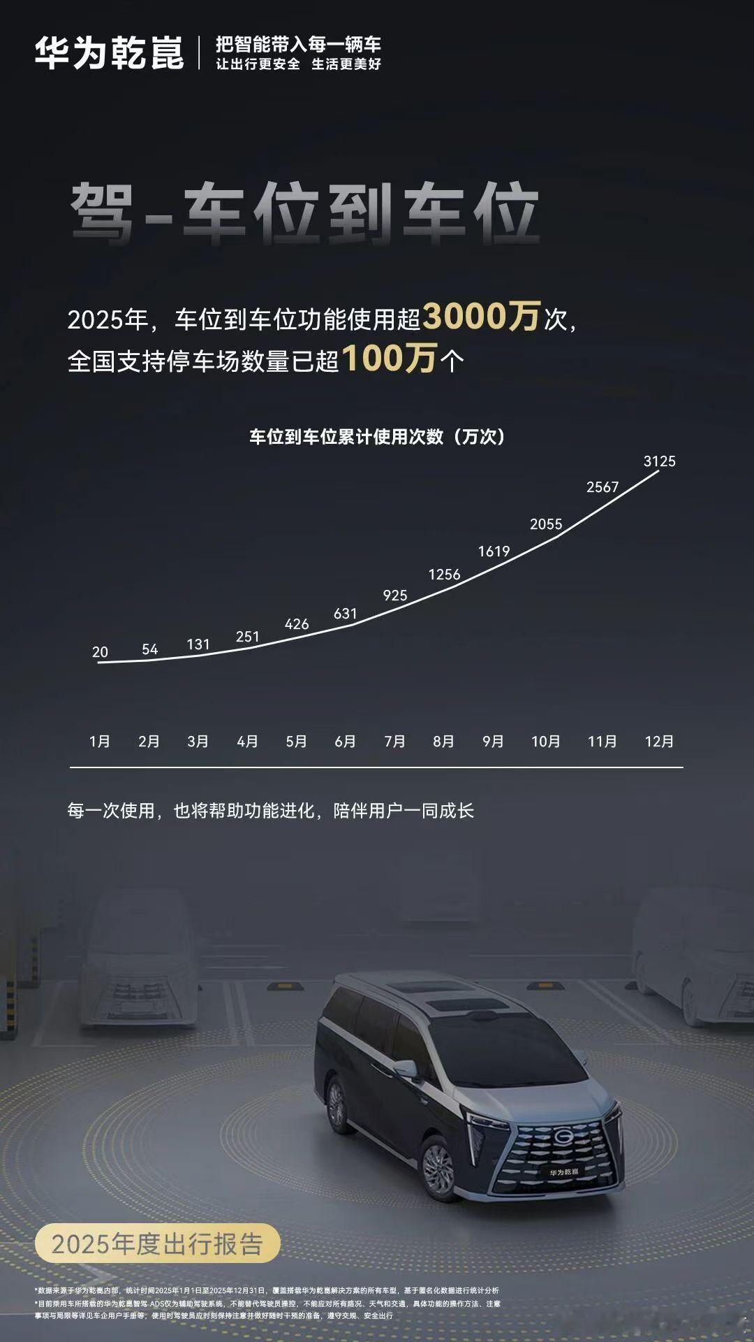 华为乾崑年度答卷 这组数据也太能打了吧!2025年直接交出累计70亿公里辅助驾驶里程的成绩单,从18.4亿到70亿,增长2.8倍的背后全是用户实打实的信赖车位到车位功能暴增155倍,全年用了3125万次,3.3亿次辅助泊车直接解放双手,再也不用为停车发愁!130万活跃用户,占比超98%,相当于买了就离不开~更安心的是安全兜底!累计避免近380万次潜在碰撞,通勤、长途都敢放心交给他。智慧助手被唤醒26亿次,无缝流转1.3亿次,智驾早就不只是开车辅助,更是全场景出行伙伴~从当初的好奇尝鲜,到现在的日常依赖,华为乾崑智驾用数据证明:好的智驾,就是让每一次出行都更省心、更安心!你今年用乾崑智驾跑了多少公里?