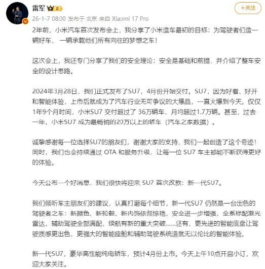 新一代小米SU7亮相,这消息太让人兴奋了!1月7日小米官宣,预计2026年4月上市,还新增了卡布里蓝配色,颜值直接拉满。 汽车博主“小米汽车日记”曝光的升级配置也很顶。全系标配800V高压平台,充电速度大幅提升,10%-80%充电仅需11.3分钟。激光雷达、麒麟二代电池等配置的加入,让续航和安全性都更上一层楼。而且座椅按摩功能全系标配,还有车载香氛系统,太懂用户需求了。此前小米SU7成绩就相当亮眼,一年九个月交付超36万辆。新一代SU7这么多升级,感觉又要爆火!