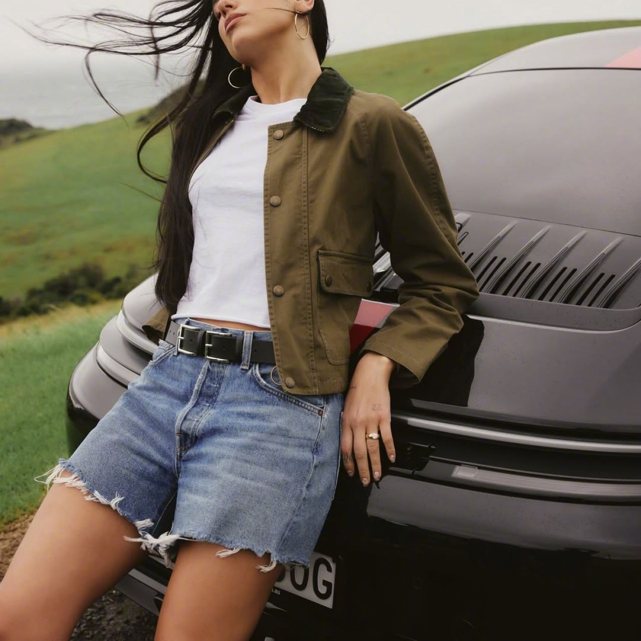 杜阿·利帕 (Dua Lipa) 出镜保时捷 911 广告大片。身穿 Burberry灯芯绒饰边棉质斜纹夹克,内搭白色T恤和Re/Done 90年代复古风短裤,脚踩Fidan Novruzova 黑色过膝长靴,整体造型休闲却不失格调,街头服饰的配搭中透着一丝不羁的粗犷。米拉服饰解析
