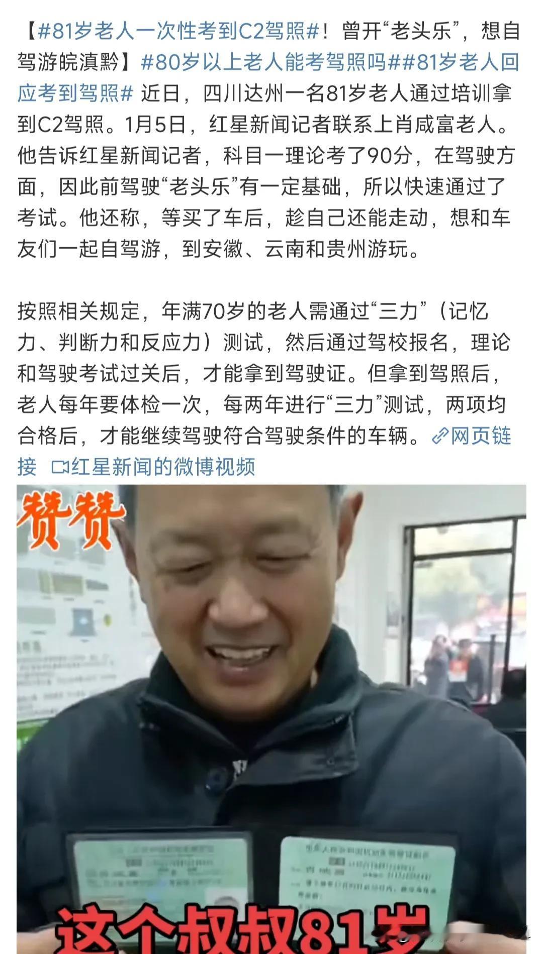 太历害了!近日四川达州,一名81岁老人通过培训,一次性考到了C2驾照。也就是说,这位81岁老人可以合法开车上路了! 据老人说,因之前有驾驶“老头乐”的基础,所以才能这么快拿到驾照!可以圆梦自驾游皖滇黔,他很开心! 视频中者爷子笑得合不拢嘴,头发半白、皮肤光滑,看着也就60多!果然梦想与好心态才是年轻的保鲜剂! 您最大的梦想是什么呢?[兔年大吉] (信息:红星新闻)