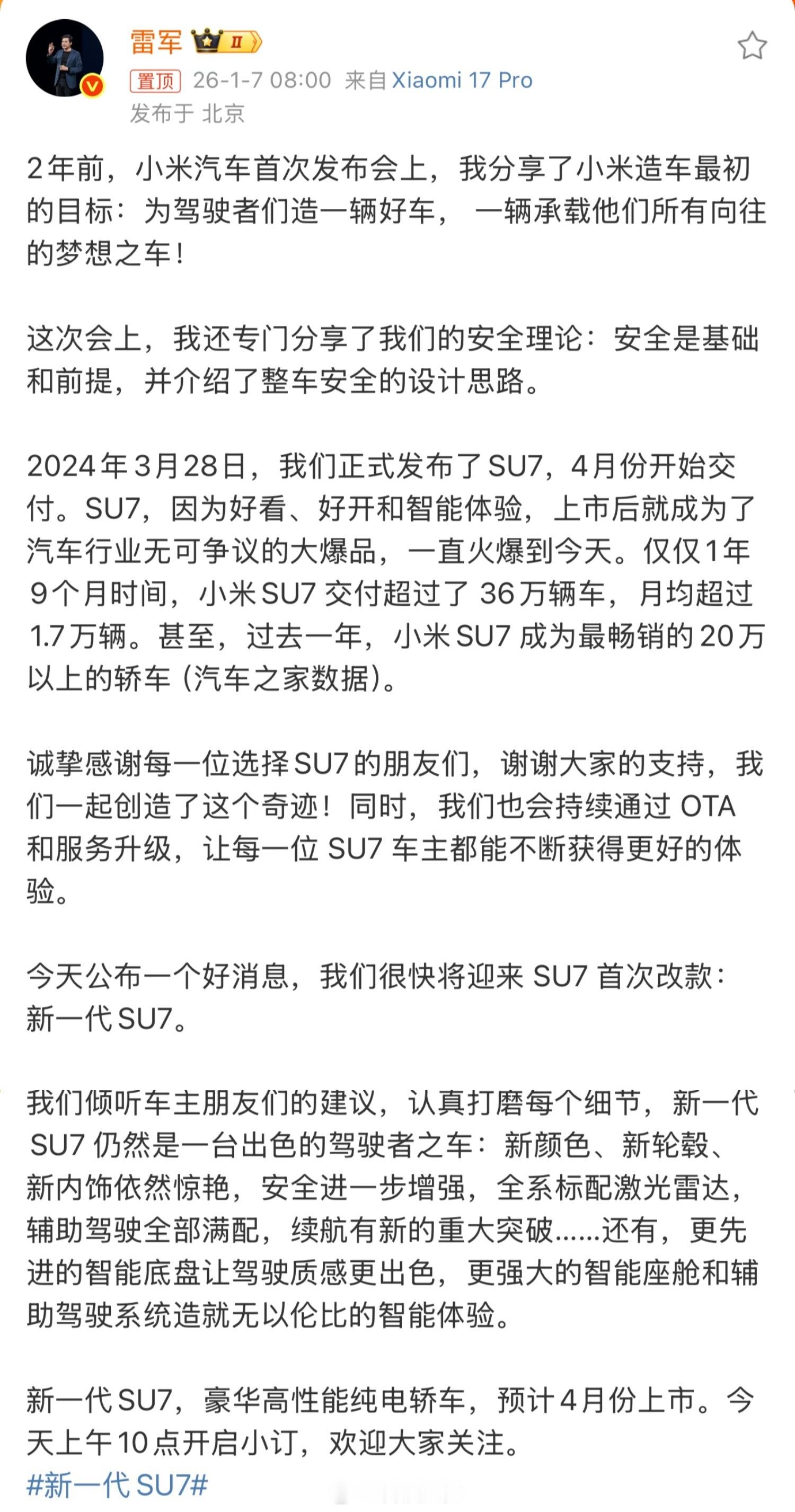 雷军官宣新一代SU7四月上市,现在已经开始接受预定了。新颜色、新轮毂和新内饰,全系都标配了激光雷达,辅助驾驶功能直接拉满,续航还有新的突破。这次升级大家觉得怎么样?新一代小米su7亮相