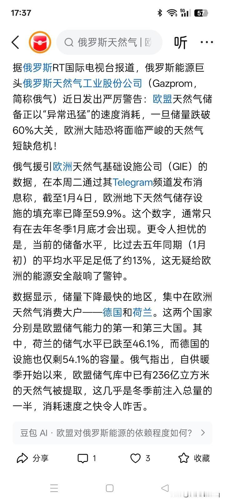 陈词滥调? 有消息说,某公司对欧洲的天然气现状提出严厉警告:欧洲储存的天然气最近以异乎寻常的速度快速消耗,一旦消耗到某种程度,欧洲大陆将面临天然气严峻短缺的局面。 其实,关于欧洲能源短缺的问题,在几年前就已经被吵的天翻地覆,甚至是饿死或冻死许多欧洲人的说法,就曾经甚嚣尘上。但到了最后、现在,好像也没有见到仅仅是因为能源短缺的问题,有任何消息说欧洲饿死或冻死了一个人。 不仅仅人是个活的,就是天然气的储存也是个活的。实际上真正应当关注的不过就是,一般来说,有储存就有消耗,有消耗就有新的输入,突然之间什么都没有了的事情几乎不存在。 欧洲没有天崩地裂,也没有天塌地陷,因此,用不着危言耸听,骇人听闻。