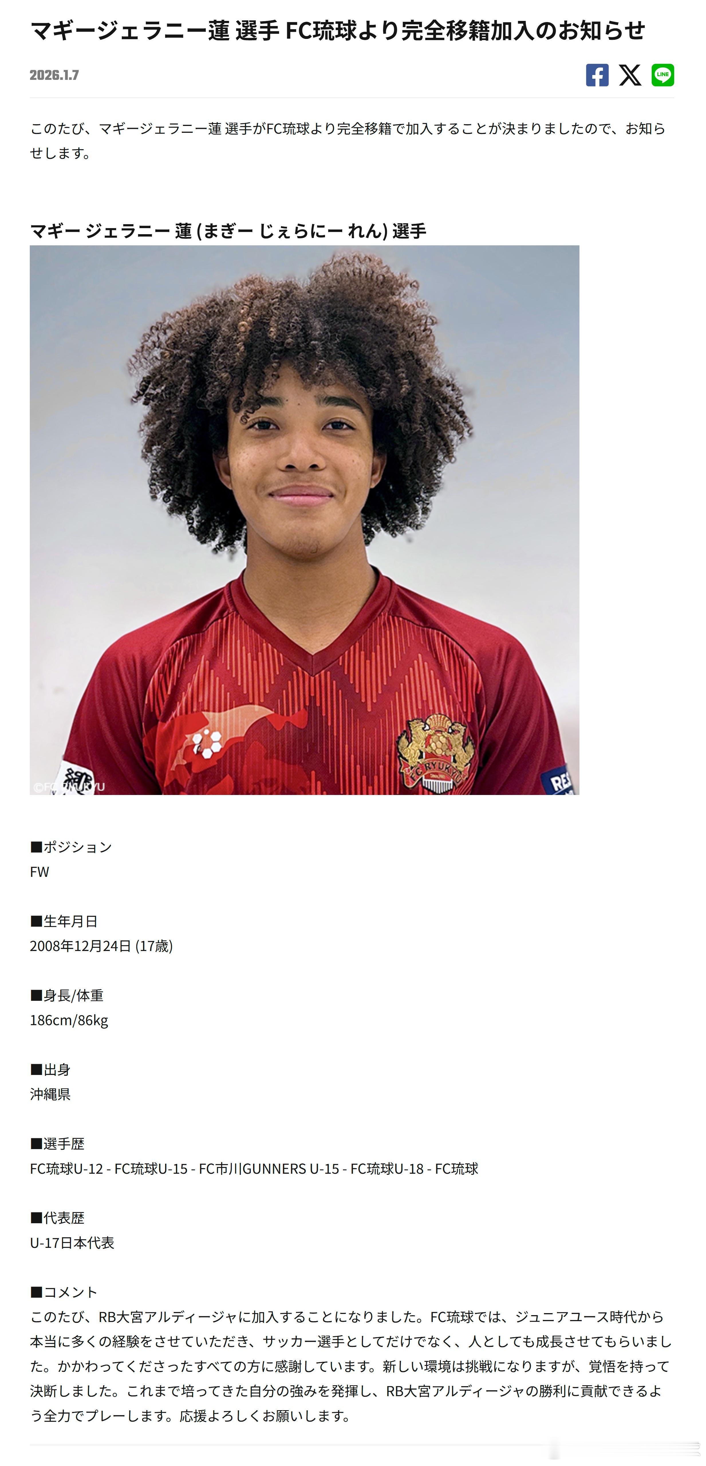 マギー ジェラニー 蓮 [玛吉·杰拉尼·蓮](Mcghee Jellani Ren, 前所属FC琉球U-18)正式转会至RB大宮Ardija。