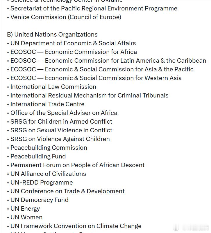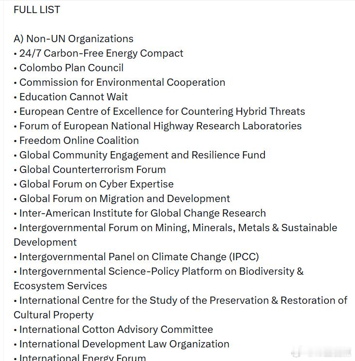 特朗普总统刚刚宣布,美国退出联合国人类住区规划署、联合国性别平等与赋权机构,以及长达66个外国组织的庞大名单。特朗普在联合国说:“联合国本应该阻止入侵,而不是创造和资助入侵!联合国正在资助对西方国家及其边界的攻击!”“不仅联合国没有解决它本应解决的问题,它往往还在为我们制造新的问题!最好的例子就是我们这个时代的头号政治议题——无法控制的移民危机。它根本无法控制。你们的国家正在被毁掉。”完整名单A) 非联合国组织24/7 无碳能源公约科伦坡计划理事会环境合作委员会教育不能等待欧洲混合威胁应对卓越中心欧洲国家公路研究实验室论坛在线自由联盟全球社区参与与韧性基金全球反恐论坛全球网络专业论坛全球移民与发展论坛美洲全球变化研究所矿产、金属及可持续发展政府间论坛气候变化政府间专门委员会生物多样性与生态系统服务政府间科学政策平台国际文化遗产保护与修复研究中心国际棉花咨询委员会国际发展法组织国际能源论坛国际艺术理事会与文化机构联合会国际民主与选举协助研究所国际司法与法治研究所国际铅锌研究组国际可再生能源机构国际太阳能联盟国际热带木材组织国际自然保护联盟泛美地理与历史研究所大西洋合作伙伴关系亚洲反海盗区域合作协议区域合作委员会21世纪可再生能源政策网络乌克兰科技中心太平洋区域环境计划秘书处威尼斯委员会(欧洲理事会)B) 联合国组织联合国经济与社会事务部经济及社会理事会 — 非洲经济委员会经济及社会理事会 — 拉美及加勒比经济委员会经济及社会理事会 — 亚洲及太平洋经济与社会委员会经济及社会理事会 — 西亚经济与社会委员会国际法委员会国际刑事法庭残留机制国际贸易中心联合国非洲事务特别顾问办公室武装冲突中儿童事务特别代表冲突性暴力中的性暴力事务特别代表针对儿童暴力事务特别代表和平建设委员会和平建设基金非洲裔人民常设论坛联合国文明联盟联合国 REDD 计划联合国贸易与发展会议联合国民主基金联合国能源署联合国妇女署联合国气候变化框架公约联合国人类住区规划署联合国培训与研究学院联合国海洋事务联合国人口基金联合国常规武器登记联合国系统首席执行官协调委员会联合国系统职员学院联合国水事务联合国大学