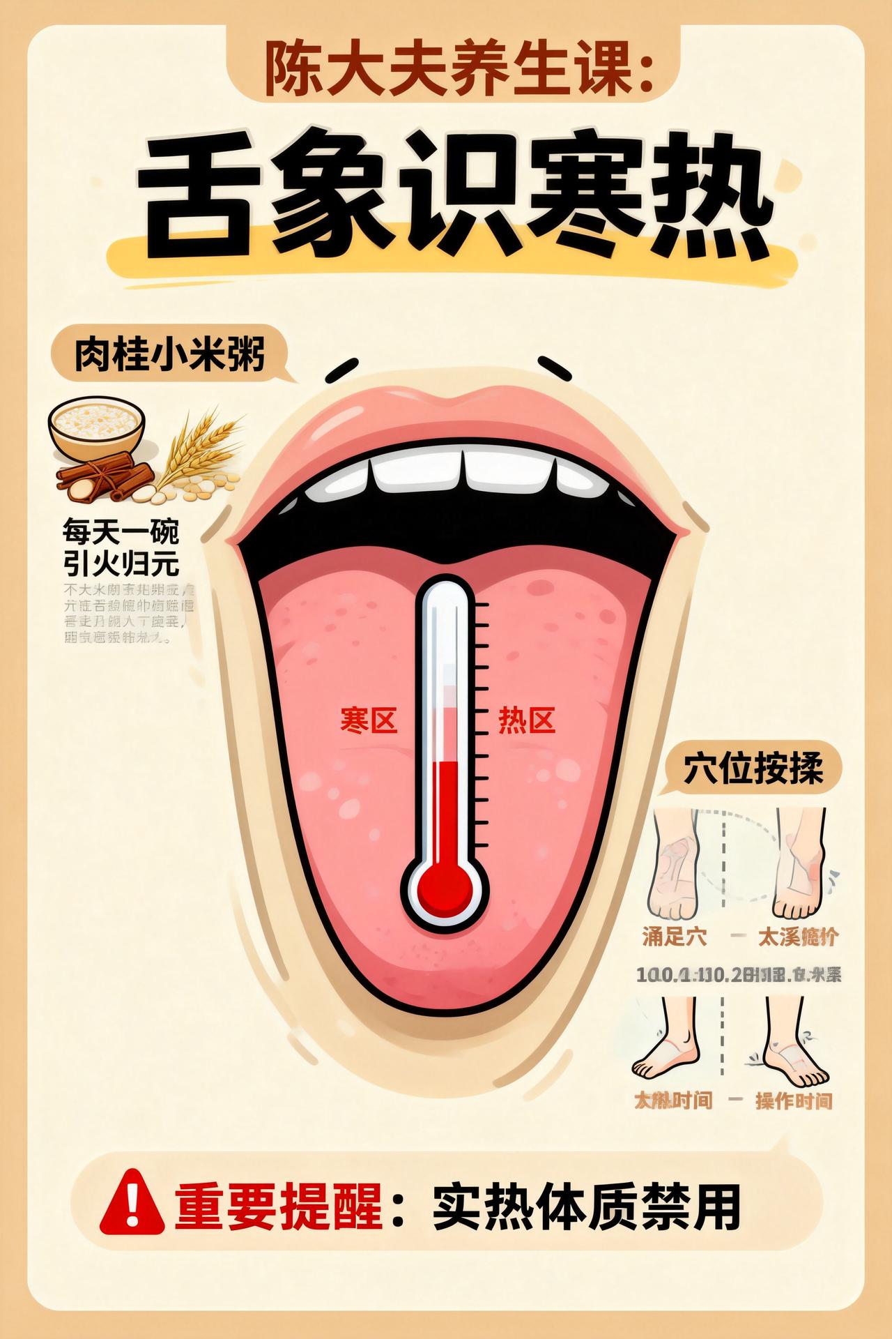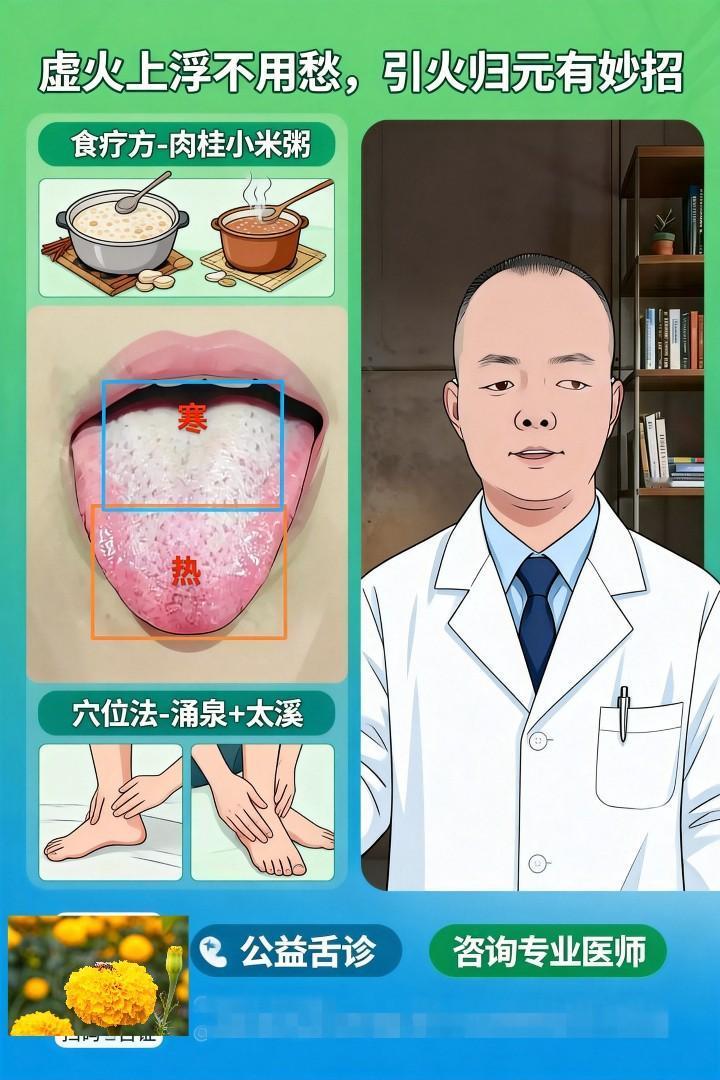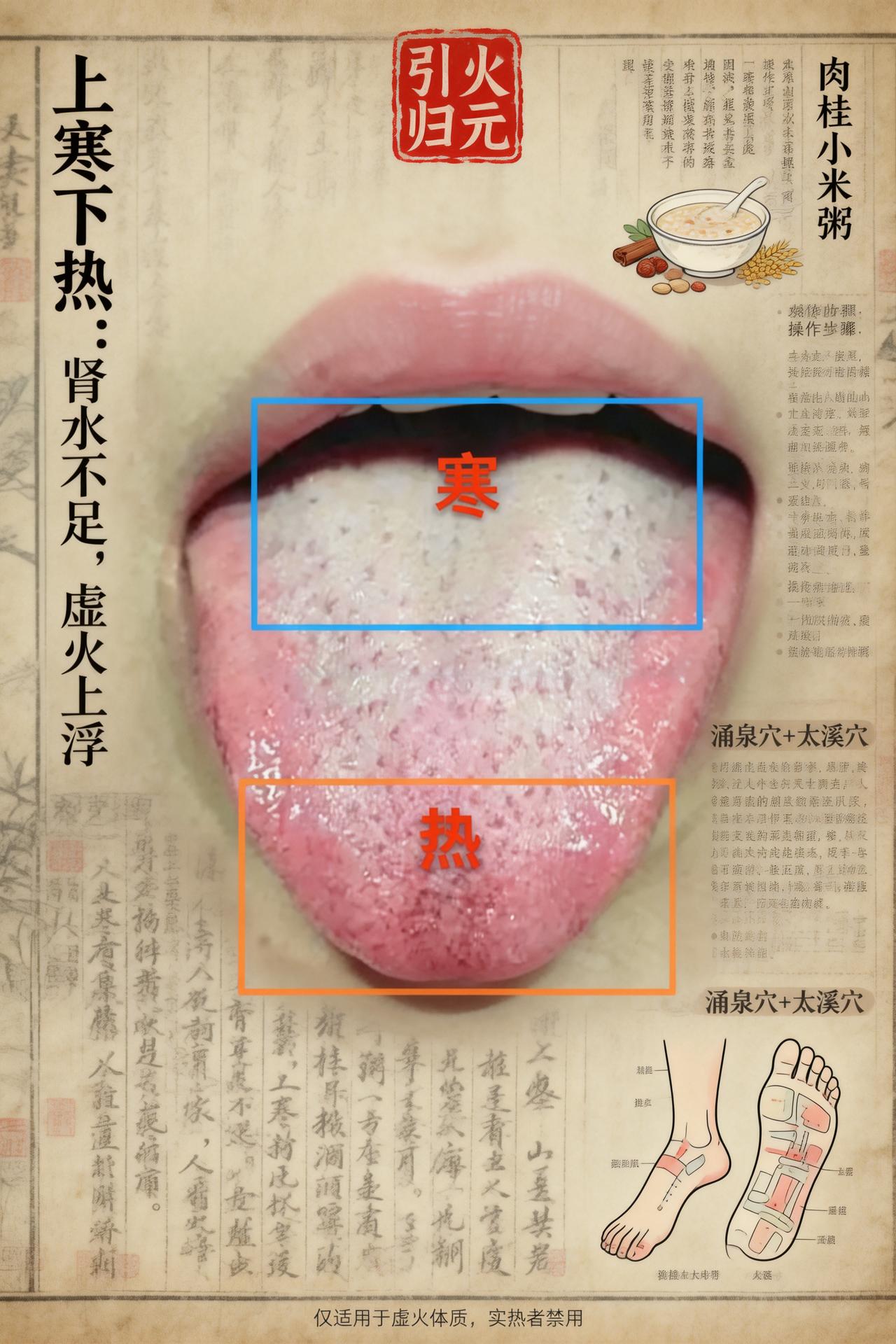 舌分寒热?引火归元就靠这两招,虚火平、肾水暖 大家好,我是中医陈大夫! 看这个舌象太典型了 —— 舌上半部分偏白(寒)、下半部分偏红(热),这是 “上寒下热” 的虚火上浮:肾水不够暖,虚火往上面跑,所以你可能上焦怕冷、总觉得嗓子干 / 冒口腔溃疡,下焦却手脚心热、心烦,得用 “引火归元” 把虚火拉回肾里,肾水暖了,上下就调和了! 引火归元两招,简单好操作 第一招:食疗 —— 肉桂小米粥 操作:小米煮烂后,加 **1 小撮肉桂粉(约 1 克,别放多)** 搅匀,每天早上喝 1 碗。 原理:肉桂是 “引火归元” 的好手,能把上浮的虚火拽回肾经;小米健脾护中,避免肉桂偏燥,刚好适配 “上寒下热” 的体质。 第二招:穴位按揉 —— 涌泉 + 太溪 操作:每天睡前用拇指按揉: 涌泉穴(脚掌心前 1/3 凹陷处):按到微微酸胀,每只脚按 2 分钟; 太溪穴(内踝尖和跟腱之间的凹陷):每侧按 2 分钟。 原理:涌泉是肾经 “井穴”,能直接引火下行;太溪补养肾水,让虚火有处可归,俩穴位搭配,虚火平得更快。 ⚠️ 划重点:这两招只适合 “上寒下热的虚火”!要是实热(比如满脸爆痘、大便臭秽干结)可别用,会越调越乱! 💬 公益舌诊一直在线 评论区发你的舌象照片,我帮你分析身体状况! ⚠️ 重要提醒:本文仅为中医药调理思路分享,不做用药指导!古方需根据体质加减,务必咨询专业中医师辨证后使用,千万别自己抓药~