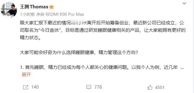 王腾的新动作来了! 就在今天,王腾在社媒主页上透露了自己的最新进展,官宣成立了“今日宜休”公司。据王腾透露,该公司主要研发睡眠健康相关产品,且初创核心成员均来自小米、华为等科技企业。