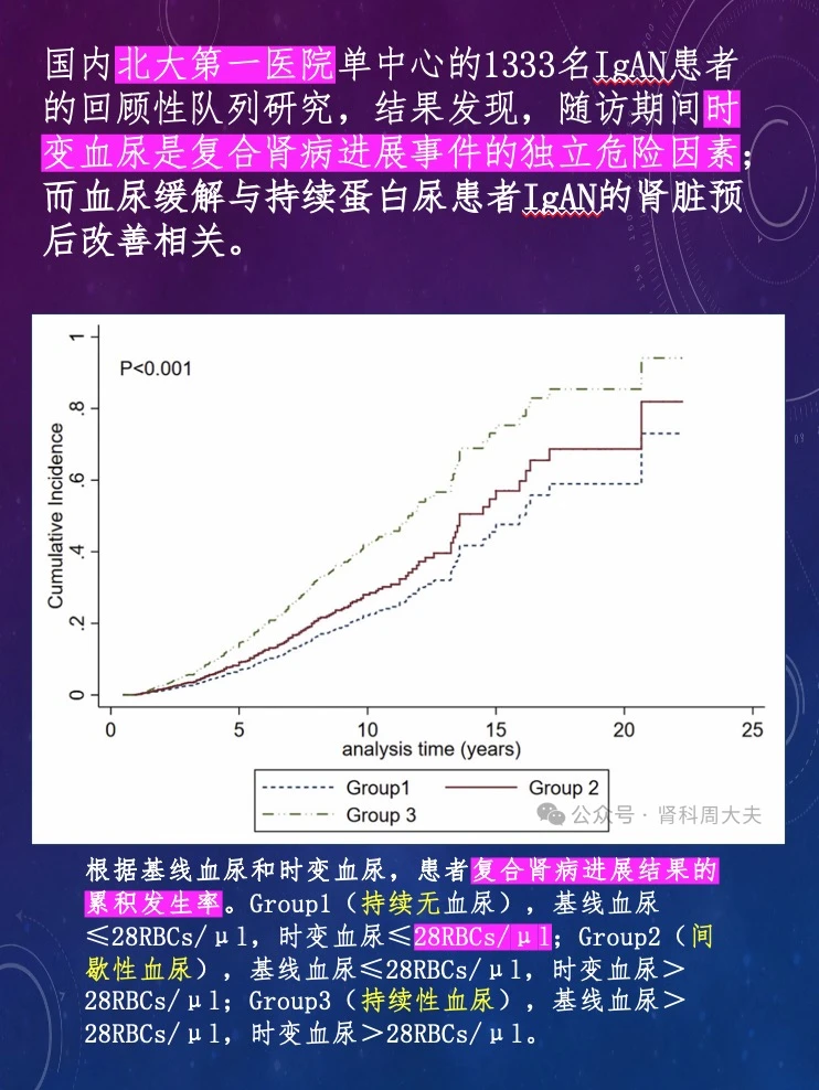 国内北大第一医院单中心的1333名IgAN患者的回顾性队列研究,中位随访45个月,复合终点事件是eGFR下降50%或进展至深衰竭。随访期间时变血尿(28RBCs/μl)是复合肾病进展事件的独立危险因素;结果: