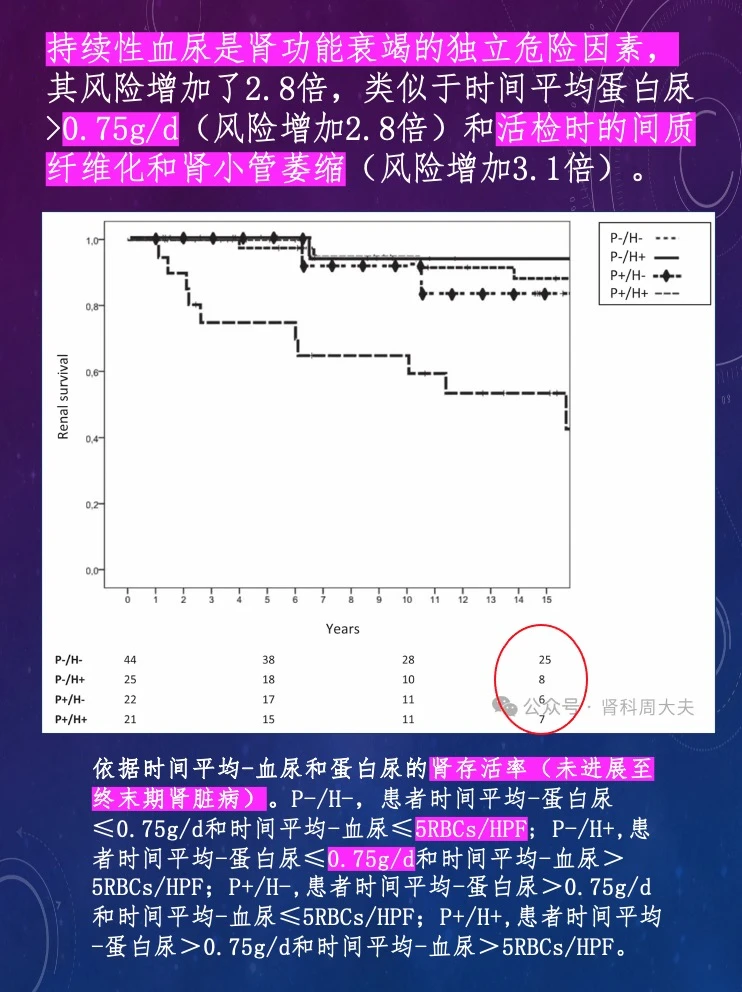 [二R]血尿高倍镜超过5(>5个RBCs/HPF)类似于平均蛋白尿0.75g/d,对肾功能的影响(包括间质纤维化和肾小管萎缩);