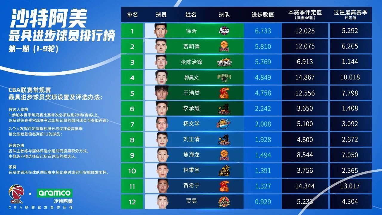2025-2026赛季CBA联赛第1-9轮最具进步球员排名出炉,辽篮二年级新秀张