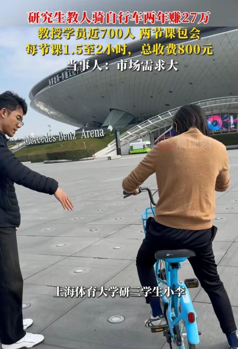 研究生教人骑自行车两年赚27万,两节课包会收费800元,每节课1.5至2小时,市场需求大! 这也要学?真是造孽,现在的年轻人越来越完犊子了。小时候直接用没有刹车和链条的车从坡上冲下去,几次就会骑了。觉得是自己是废物的,看看他们就好了 刘禅:阿斗都没有这么难扶,这还用教?