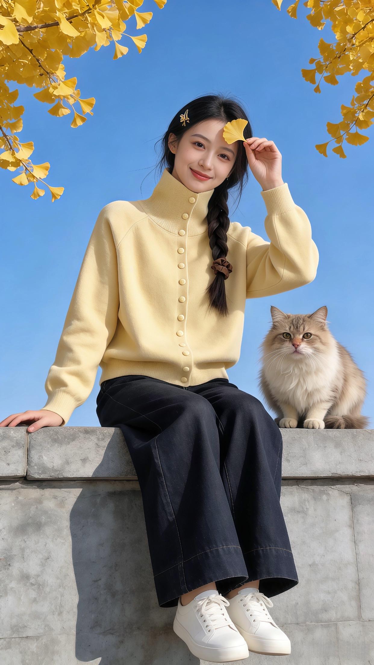 优雅东方韵,浅蓝上衣配米色长裤,漫步古风庭院,尽显时尚与古典的完美融合。