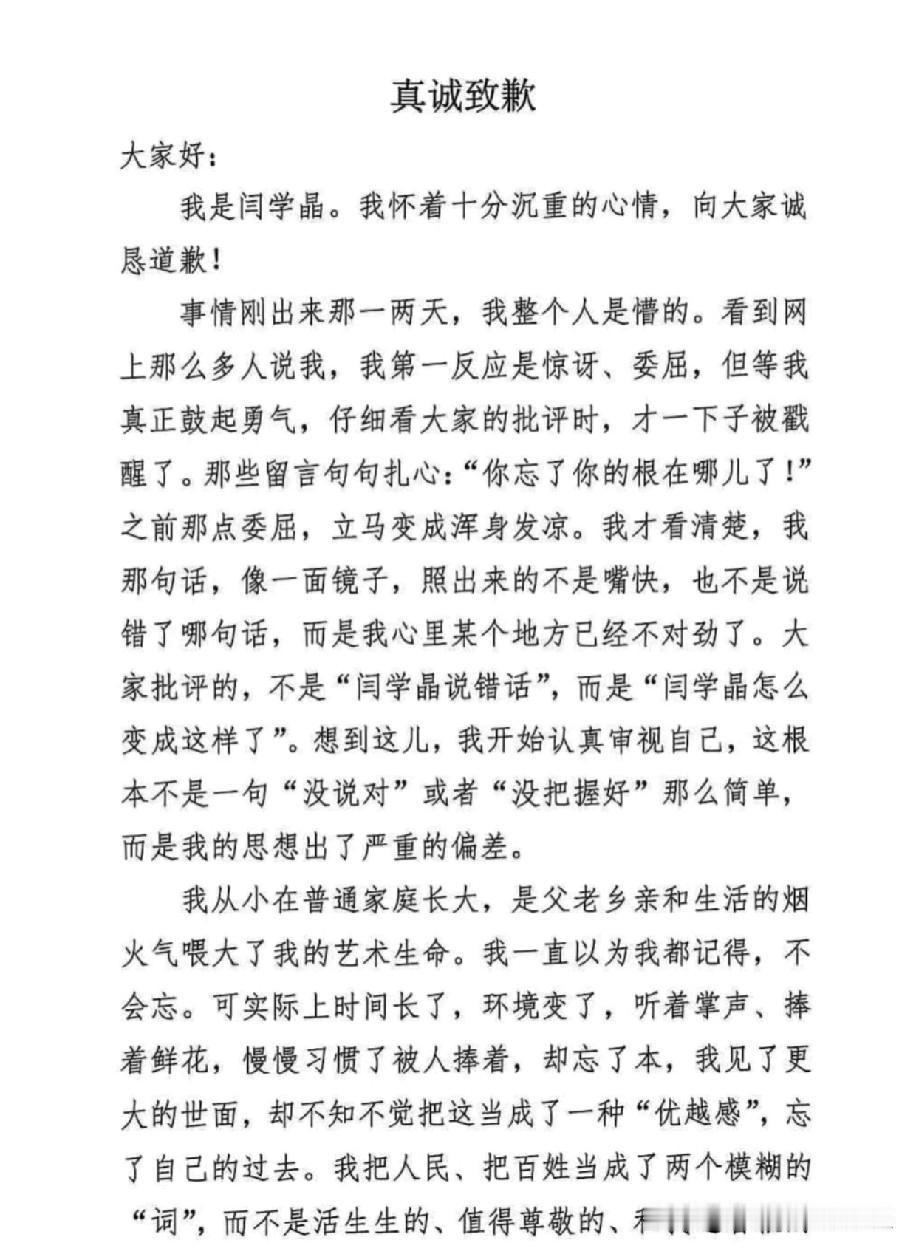 闫学晶道歉了!文案写得真挚诚恳,看起来是真的意识到错了。 起码是意识到怕了! 意识到老百姓能让她成为大明星,也能让她一夜之间人人喊打,失业在家。 因为闫学晶不是明星,没有什么粉丝,而是靠普通人的喜欢,才有的今天的成就。 不过闫学晶这道歉也挺有意思的。 没有发到引发争议的源头平台🫘,而是发在了自己的朋友圈。 朋友圈不都是她自己同阶层的明星,发给他们看有什么用呢?