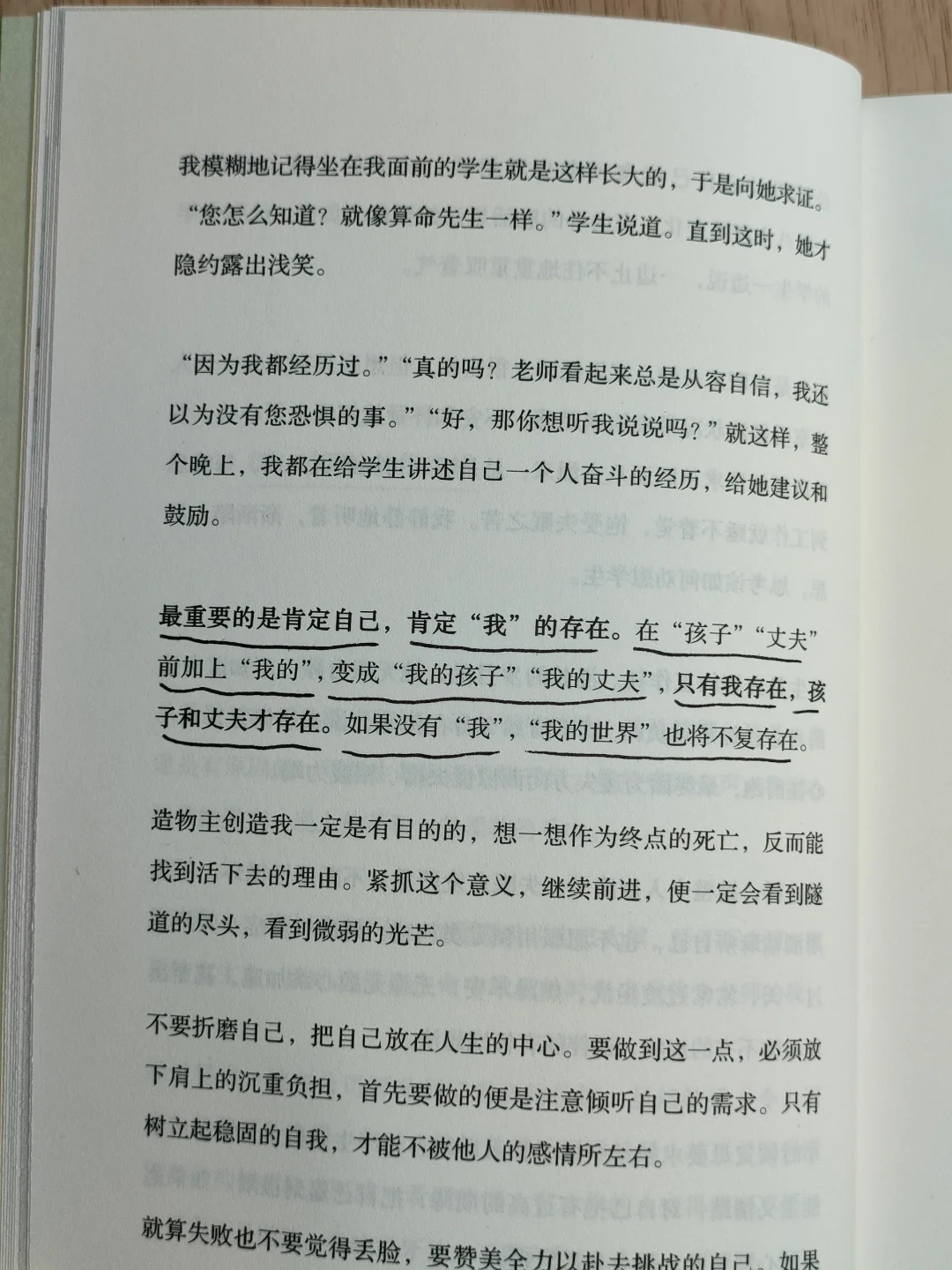 蕞重要的是肯定自己,肯定“我”的存在。在“孩子”“丈夫”前加上“我的”,变成“我的孩子”“我的丈夫”,只有我存在,孩子和丈夫才存在,如果没有“我”,“我的世界”也将不复存在。