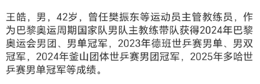 樊振东带给了王皓最好的成绩 “王皓,男,42岁,曾任樊振东等运动员主管教练员,作为巴黎奥运周期国家队男队主教练带队获得2024年巴黎奥运会男团,男单冠军,2023年德班世乒赛男单,男双冠军,2024年釜山团体世乒赛男团冠军,2025年多哈世乒赛男单冠军等成绩。” 希望男主教练王皓在洛奥期间能充分保障巴奥男单冠军樊振东的合理权益。