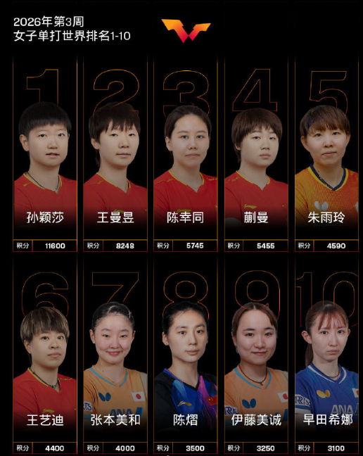 女子单打,中国队球员孙颖莎、王曼昱、蒯曼、陈幸同位列前四,王艺迪位列第六,陈熠位列第八。