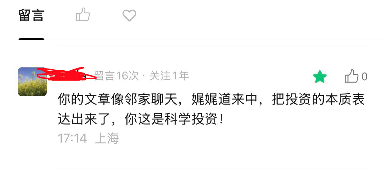 有味位网友留言说:你的文章像邻家聊天,娓娓道来中,把投资的本质表达出来了,你这是