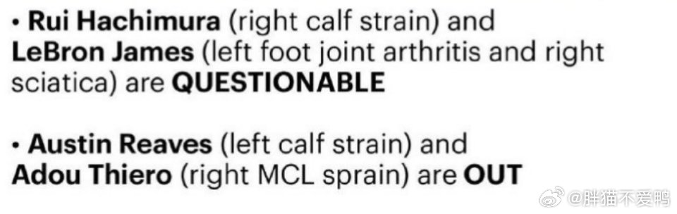 湖人老鹰明日伤病名单来了!湖人迎一个好消息!以及一条坏消息!湖人这边——八村塁(右小腿拉伤)确认出战!詹姆斯(左脚关节关节炎+右侧坐骨神经痛)出战成疑!里夫斯(左小腿拉伤)、蒂耶罗(右膝内侧副韧带扭伤)缺席!老鹰这边——肯纳德(颈部扭伤)纽厄尔(右股四头肌挫伤)出战成疑!波尔津吉斯(左跟腱炎)里萨谢(左膝骨挫伤)丹特(右膝前十字韧带撕裂)缺席!首先坏消息!詹姆斯明日继续待定,由于背靠背影响,本赛季老詹在背靠背的比赛都会是待定状态,明天大概率是要缺席了,虽然今天打国王,老詹状态不好,但是以湖人目前的状态,是缺谁都不行,缺少老詹马刺那场就清楚了,东契奇一人被马刺全队追着打!所以老詹缺席,湖人战力损失一半!其次好消息!在释放了两次烟雾弹后,八村塁已经确认明日出战!此前因伤势已缺席了七场比赛!八村这个点对湖人非常重要,湖人目前三分联盟垫底水平,而八村的三分是全队最准,多少也能提高点湖人的三分命中率,能拉开空间还可吃一点球权,场均12.7分3.8篮板,明日他大概率会替补出战,且会有时间限制!湖人詹姆斯里夫斯湖人国度洛杉矶湖人
